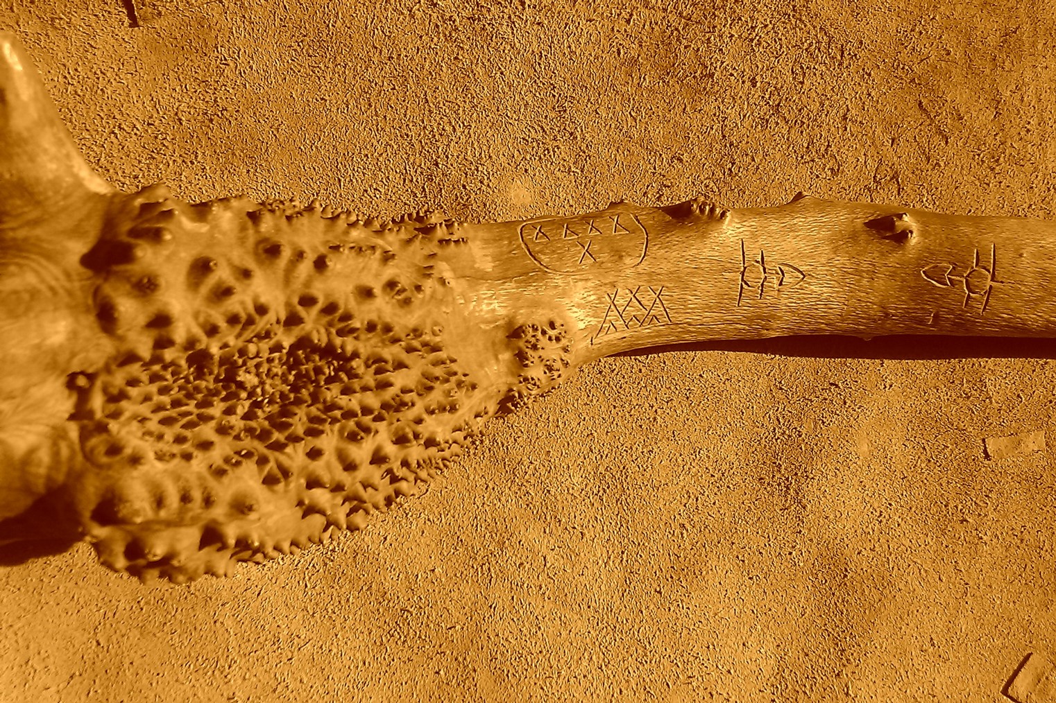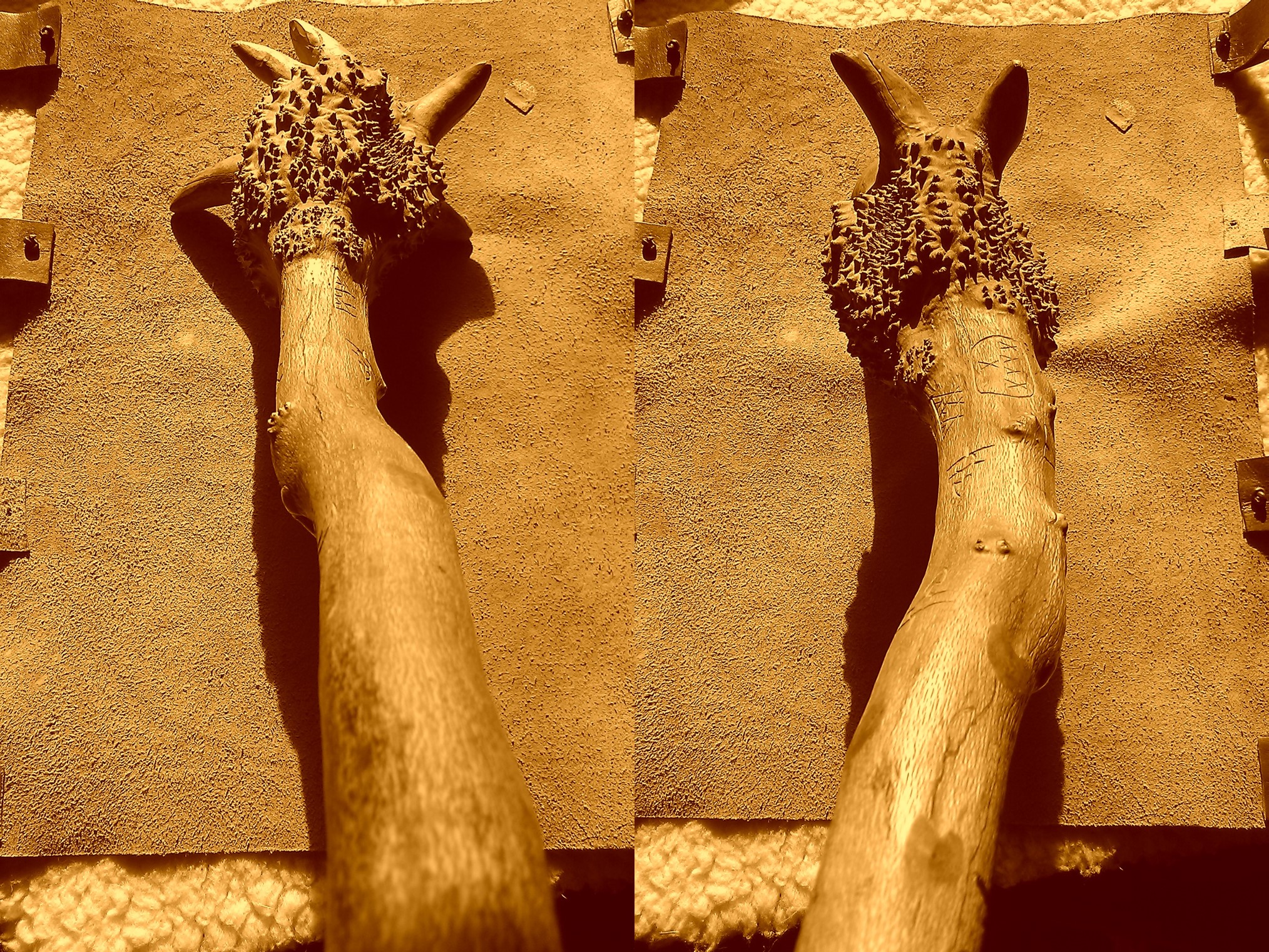 Such interpretations are made in order to convert this object into something of good use. Despite its war-club like appearances, based mostly on its burly, knotty and very pointy surface at its upper end, this humanizing process is essential to making the best use of it as a ceremonial object. For this reason, I am providing these images for review by people interested in this tradition-based philosophy for this object, and its potential uses. This same reasoning can be used to produce your own objects, should you so choose. Which is another reason I have posted this page followed by Part 3 in a few weeks.