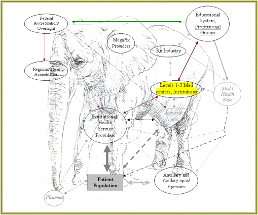 Another level in this system (or part of the elephant) can be defined for the agencies that oversee these service providers. These are the agencies which monitor their practice behaviors to ensure that we are receiving some sort of care that meets specific standards. Some of these agencies are higher up on the totem pole of progress in this method of health care monitoring, with those situated higher up usually more often related to better performing programs. For the most part, these agencies or offices/programs exist to ensure adequate health care procedures and “sufficient” medical practices.