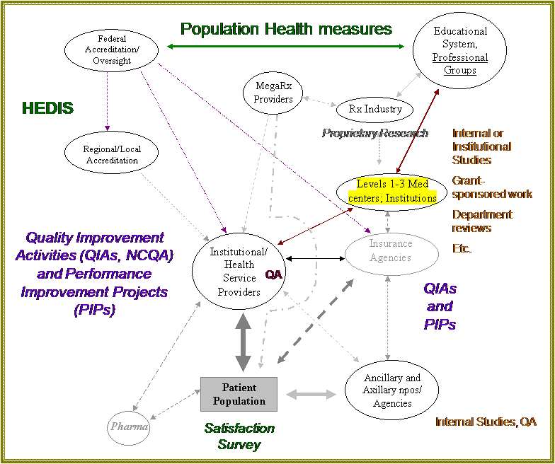 These various methods of reviewing ‘the elephant’ also provide us with whatever insights are needed to produce a much better ways to monitor that which is already in place. We can then add to this system by designing new methods to measure and interpret any impacts these changes have on human population health in general. With the exception of Level 7 above, there are a number of methods currently in use for monitoring each level of the health care system as noted above. Many of these activities pertain to such matters as accreditation and quality assurance. Some are simply internal studies engaged in due to other institutional requirements, such as the production of an end-product for a grant-sponsored project or the development of a final report used by the research group to continue the flow of incoming financial support. For this reason, we find almost everything that is monitored has both internal and outside organizations engaged in this process. These outside agencies are typically related to either the reaccreditation process itself, or some specialty group involved with this process for the purpose of making sure the program being reviewed is trustworthy and reliable in terms of the quality of its medical care. It is not unusual for fairly large health care systems to undergo numerous interactions with governmental organizations, special interest groups, and even npo’s in charge of monitoring certain aspects of population health and health care outcomes. We find some agencies to be engaged in monitoring just the process of administration, with limited concern for the outcome and more attention paid to such things as abiding by specific rules or protocols for treatment, or remaining efficient in terms of administration and billing practices. Still other agencies pay close attention to the system as a business, reviewing income activities and behaviors, at times even searching for ways to cut costs when it comes to managing the program being reviewed.