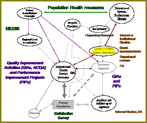 One level of analysis pertaining to population health that has yet to be fully realized as a potential source for public health knowledge and understanding, pertains to the best use of prescription or drug data. The above illustration demonstrates the levels of data that are already out there for use in population health monitoring practices. Quite a few methods for analyzing population health are in place, and engaged in as part of an ongoing process of measuring the overall performance of the health care system and its various components (insurance agencies, hospitals, doctors, patients, etc.). The level between Federal or National programs and large-scale institutional or agency level programs is a level that is not yet heavily employed as some part of a public health monitoring system, a level one step above our major method of researching such information and reporting our outcomes (in yellow)–the Corporate level (MegaRx and industries) (Hint: click on these images for enlargement and to see the details).