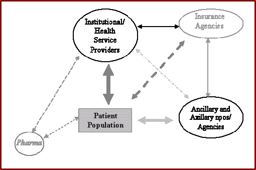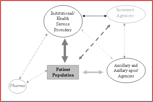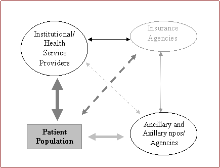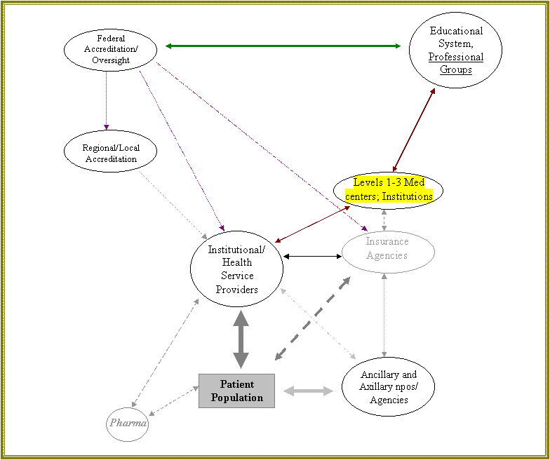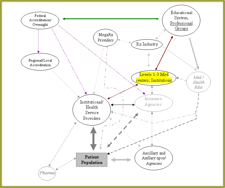 A number of other services and agencies are added to this system to produce a fairly complex relationship used for the development of large programs meant to serve large population groups. The two remaining components that can be added to this system are the large-scale international or electronic-processing providers for prescription drug services, and the various forms of health education service providers that exist outside the traditional university/medical school setting. These to groups are, generally speaking, For-Profit agencies with good intentions in terms of public, community and institutional or agency-related health, but they are also consumer-minded businesses with goals related to both internal progress as well as improved population health outcomes.