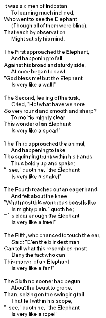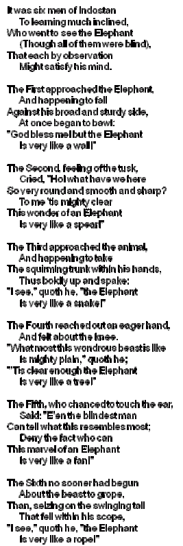 Another much broader meaning of the phrase ‘to see the elephant’ is a more traditional interpretation of philosophical meaning of the ‘elephant’ in the history of mankind. This more ancient, philosophical has much broader applications than the midwestern meaning for this phrase. The more traditional ‘elephant’ eluded to with such a phrase pertains to the famous story of several blind men trying to define the elephant that stands before them. A well-known poem, “The Blind Men and the Elephant,” by John Godfrey Saxe (1816-1887), underscores just how fragmentary knowledge can be when it is produced by scientists.