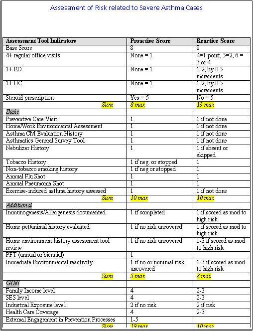 To define risk for a patient with asthma, two scores need to be developed to determine the degree of proactiveness the patient/PCP combination undertake due to the patient’s condition [the proactive score], and the degree to which the patient alone responds to his/her asthma-related problems, condition or visits [the reactive score].