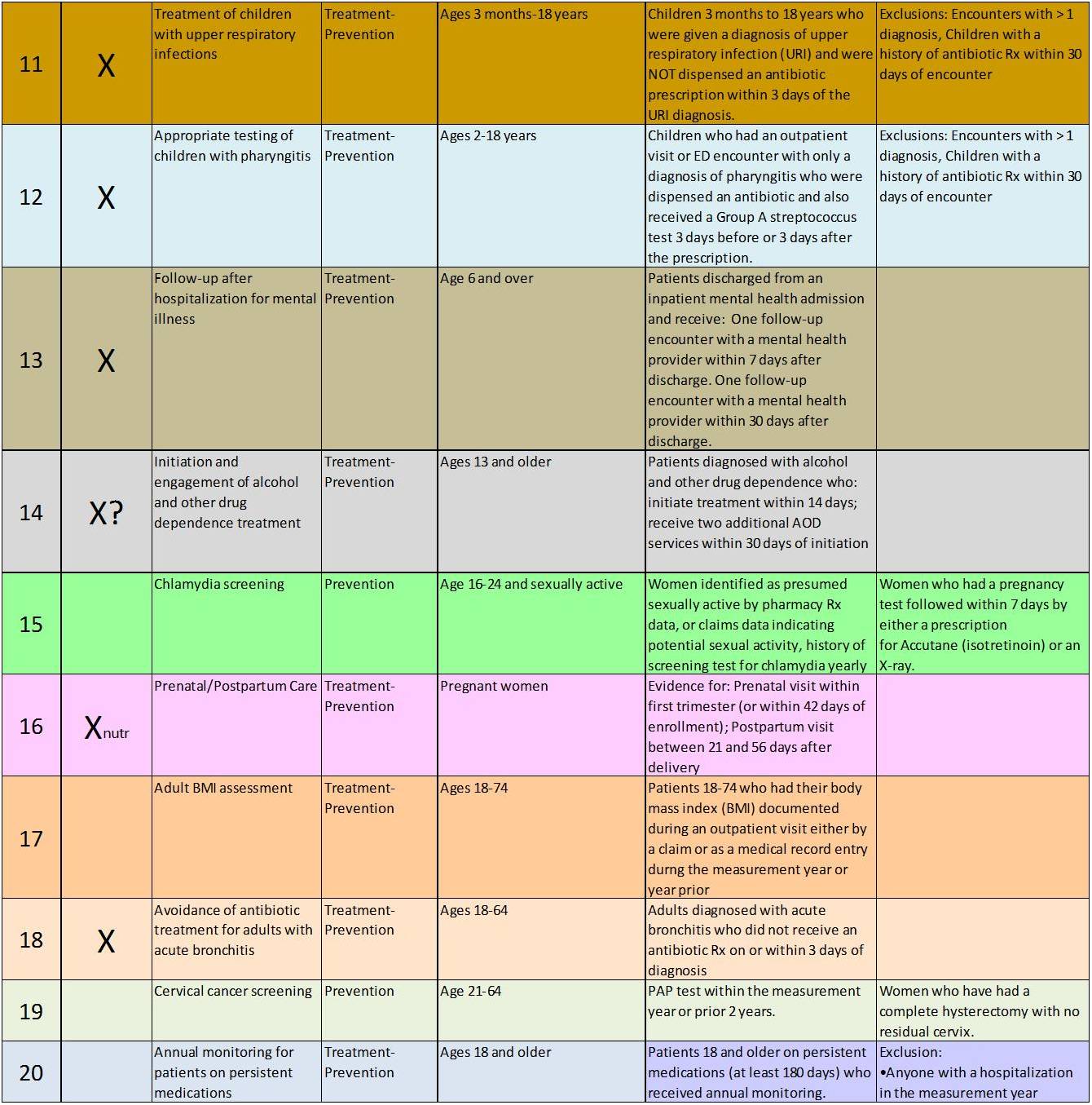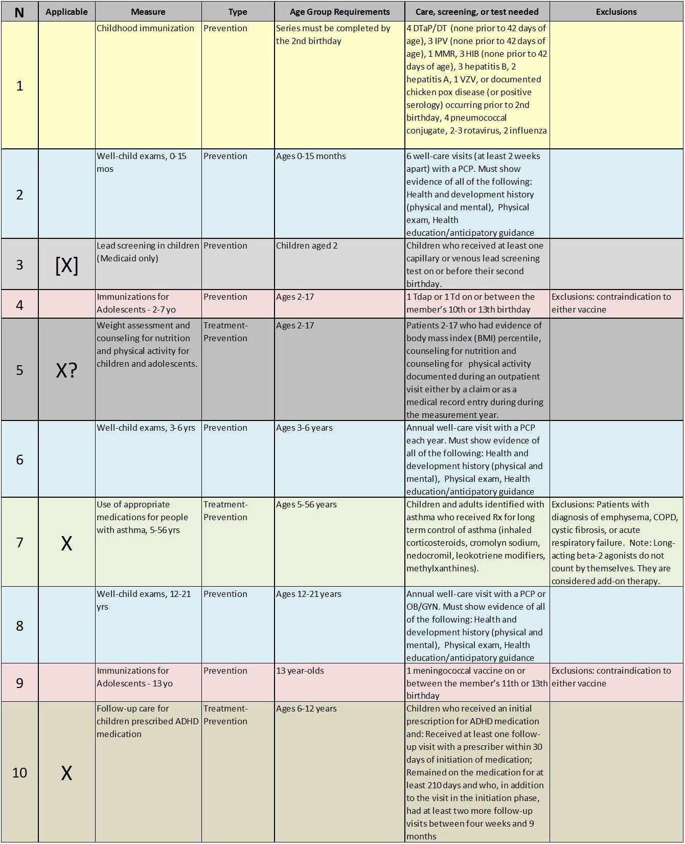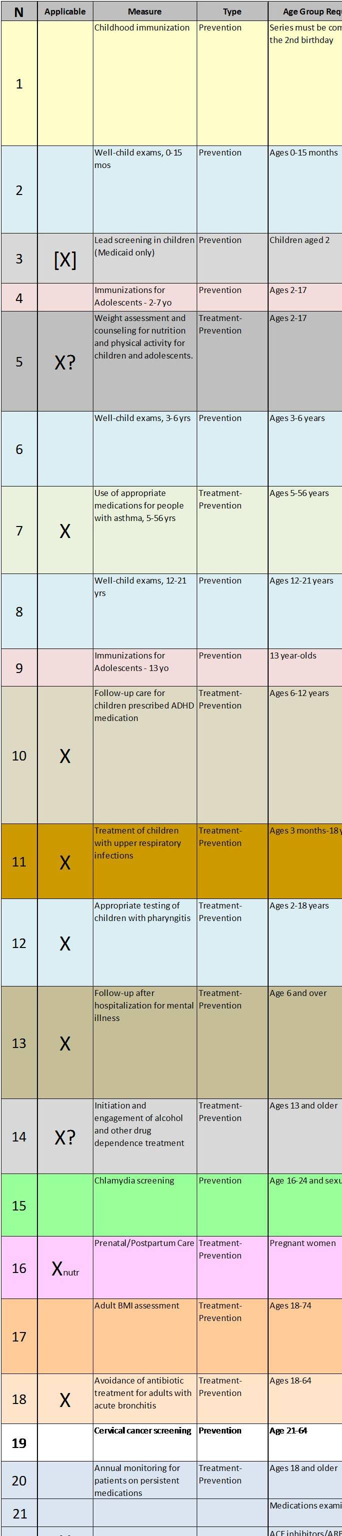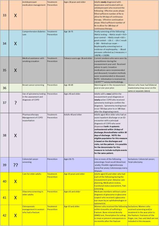 The following figure depicts the age ranges for all 2010 HEDIS measures. The x axis represents age in one year increments (range 0-100), with blue bars representing the years of age during which a patient eligible for a given HEDIS study. The name of study is noted in the second column on the left. The first column of data indicates whether the HEDIS measure may be considered primarily preventive in nature, such as a breast cancer screening measure, or a measure that represents a combination of therapeutic/reactive and preventive medical events (i.e. diabetes studies test number of visits, HgA1c>7.5, yes/no for ophthalmology visit, yes/no home monitoring practices, htn present, htn medication in use, whether patient is insulin dependent or not, etc.).