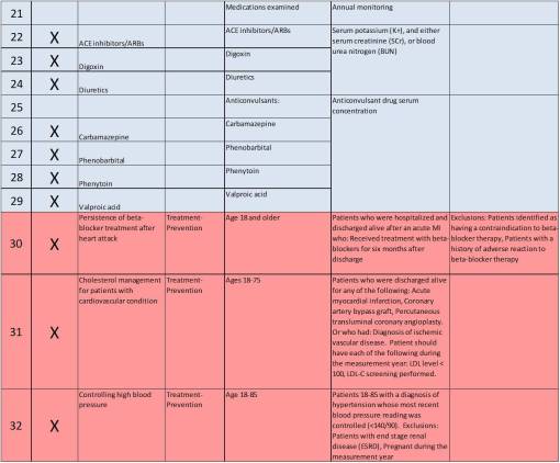 A number of HEDIS measures have potential application to the development of methods for monitoring prescription activity, using a methodology focus on script counts and amounts, in conjunction with medical hostory data provided by claims documents that include ICD codes in their entries. Those studies most related to this approach for monitoring physician-patient script performance are summarized in the following table: