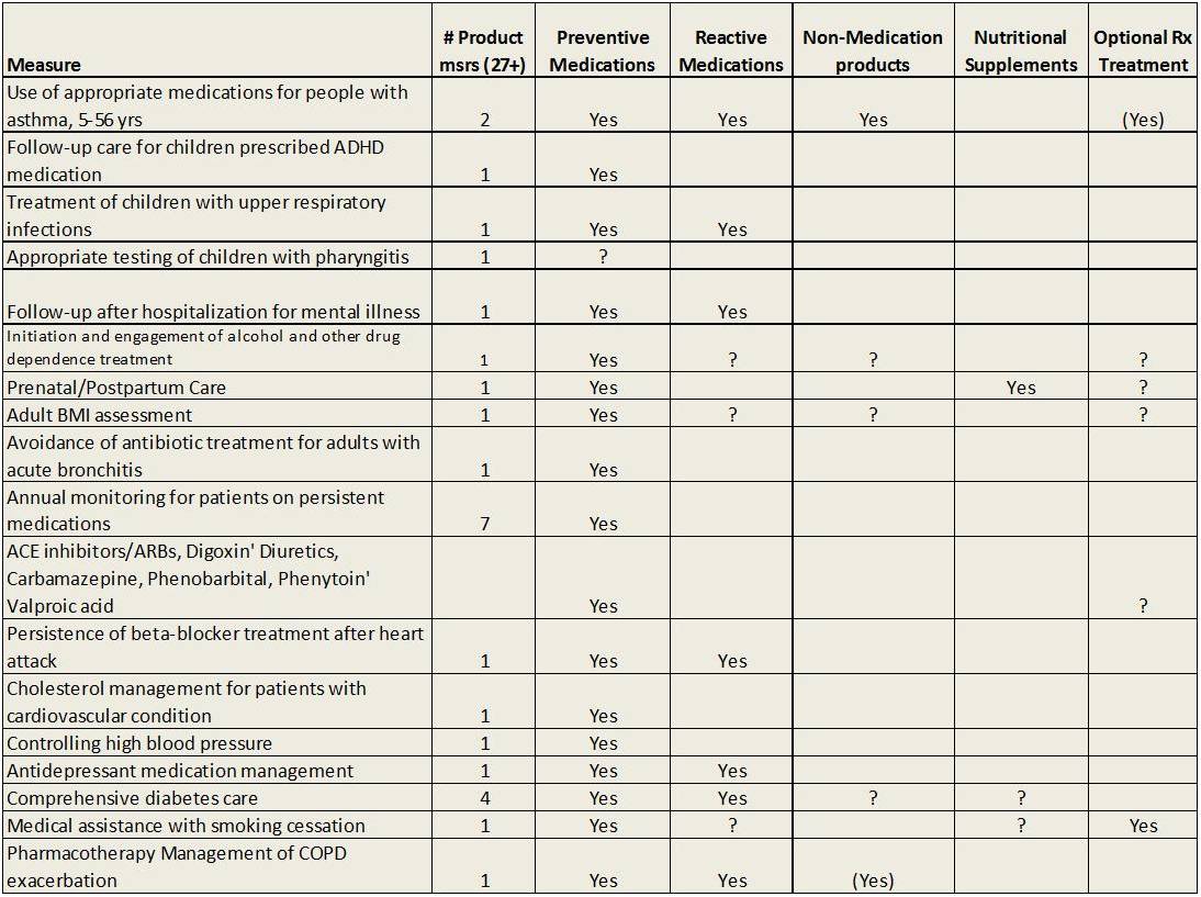 Such uses for prescription data have broad applications to already present HEDIS-related internal studies already put in place. A number of these HEDIS-related activities have at times been considered “optional treatments”, that is to say they are not a necessary part of any standard HEDIS/NCQA measure, but are often included in HEDIS/NEQA measures. Example of these include reviewing whether or not a patient obtained a prescription to assist in the cessation of smoking or taking a medication designed to treat some chronic disease or condition with well-documented long term financial and QOL consequences, such as insomnia, GERD, fibromyalgia, alcoholism, MS, RA, lower back pain, and numerous other chronic medical conditions of health related problems.