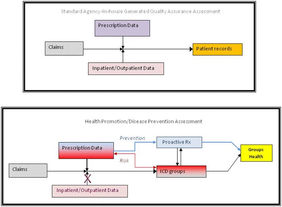 When we compare the in-house method of reviewing medical data to a non-institutional method of review, we notice that the focus has to be primarily on the script history, from which a medical status is defined for each individual found in the datasets provided. The task then become trying to merge this information with other information sources available within an outside corporate work setting, focusing primarily upon claims records instead of clinical records.