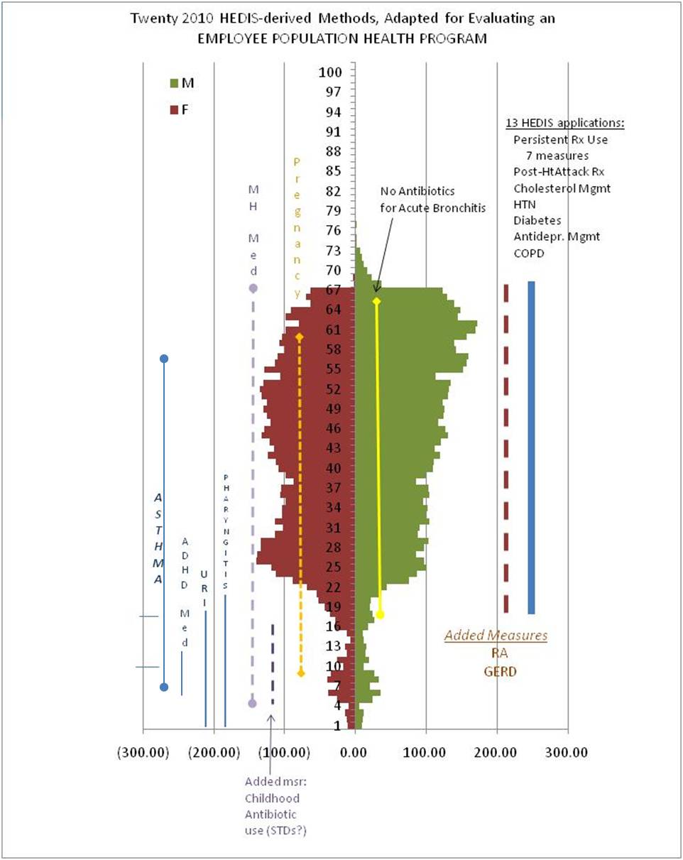 Once these adjustments in the research project are completed, a complete assessment could then begin. It is expected that a basic review of population health must consist of about 25 disease states and/or HEDIS topics, producing about 40 to 50 measures. In the following example of this type of evaluation, GERD was the focus of the reviewm but an equally important addition was fibromyalgia (which has a F:M ratio of approximately 4:1) in order to counter the focus on job-related chronic disease due to the higher numbers of men in this part of the population.