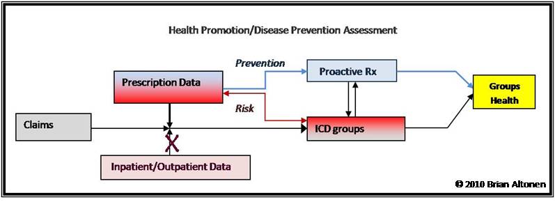 The separation of Proactive from Reactive responses (defined as ‘Risk’ in the figure above) is done because of the significant differences between the approaches that would have to be taken regarding any interventions that could ensue. For a program with a small children population, we could merge the Childhood age (0-18) URI and Pharyngitis HEDIS measure results together, and then evaluate each separately should such a need arise due to a positive outcome of the study group as a whole. For a program with a small nutritionally-based chronic disease prevention/management program, a program with too few HTN, HL and NIDDM clients, a “Group” could be developed that combines these together to form statistically measurable numbers for the preliminary summary report, followed by a follow-up on each of these individual ICD/disease types. This group could be approached as a unit by way of some valuable intervention method, such as a clinical service-based change in scheduling and/or costs.