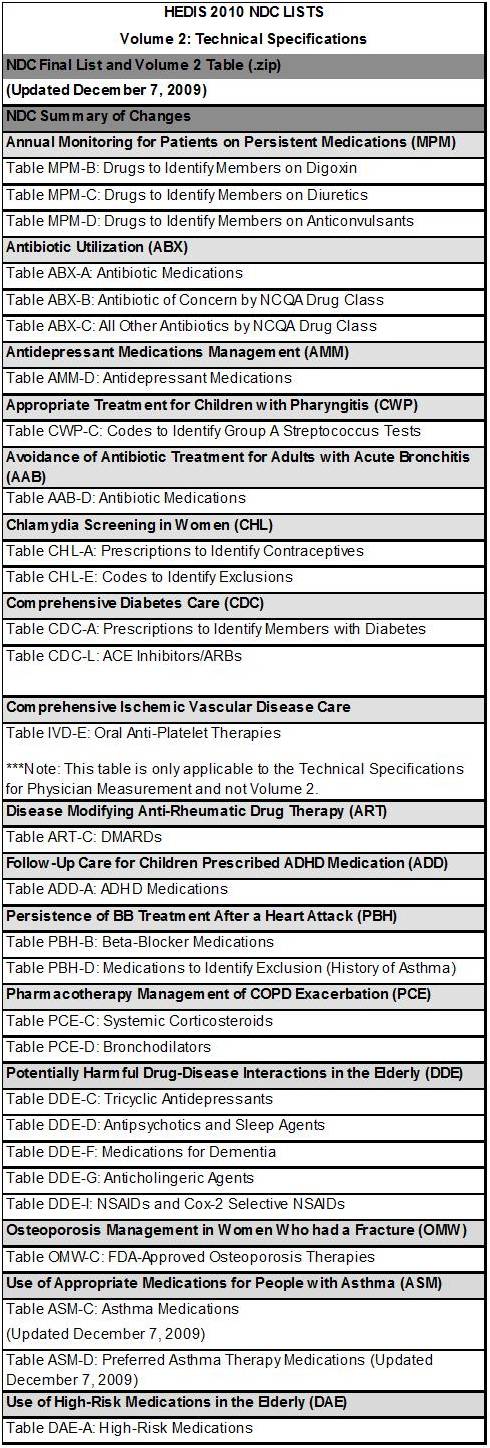 To evaluate drug use in accordance with HEDIS standards, the following data must be placed into a series of algorithms used to identify those members with prescriptions that serve as disease indicators. The details about these lists and their ICDs are provided by the national HEDIS website. The following is just the listing of these drug tables used to diagnose patients based on their prescription drug use history. This document can be accessed for its links to the tables at http://www.ncqa.org/tabid/1091/Default.aspx (most recent date of access April 12, 2010).