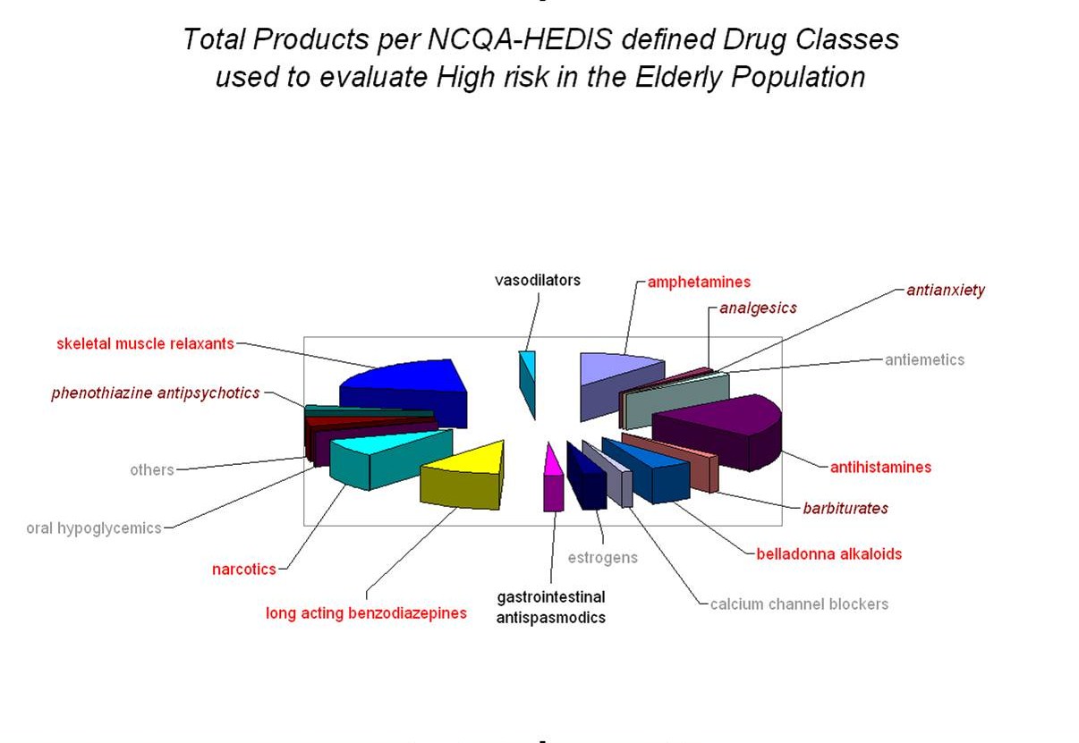 One of the more complex studies that is done as a part of HEDIS, and rarely as an internal QIA study due to its complexity, is the review of the use of medications considered to be high risk to members of the aging population (esp. 65+) [DAE]. The following is the prescription drug assessment process. For reasons related to length and complexity of the listing, note that brand names could not be included on this flowchart.