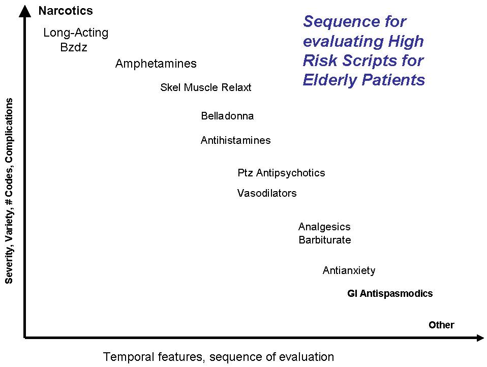 In the above categorization of the various subclasses applied to these 9,089 NDC coded products, Those with their category names in red are considered, for this review, to be of special interest, followed by those of a dark red color, black, and finally grey. The variety of products (# of NDC codes, used to define the size of each wedge), and type and use of the product was then used to assign relative risks. With these risks established, a sequence of review could then be defined, in which the reviews are carried out one drug class at a time. For example, for elderly patients the following hierarchy may be established for this process: