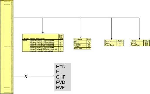 Due to the size of the original dataset for this HEDIS-based approach to reviewing scripts, and due to the value that can be obtained by engaging in this type of analysis in a fairly detailed manner, smaller groups sets are used to define the case queries. For example, consider the following three listings of the contents for each of the major risk classes for prescriptions medicine defined in the above pie chart.