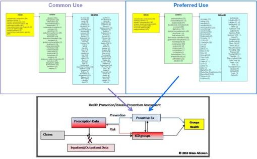 In essence, since this research was carried out based solely of Rx information, with predefined features for positive diagnosis and compliance with NCQA definitions for inclusion/exclusion, only the script utilization part of this review process was carried out. For the above studies, claims data was not employed to develop the prescription drug study results, only to define the list of those who qualified for such a study. This suggests that Claims data may be used to define the population for the first pass through this population health review, followed by more specific studies based only on the members who qualify for such studies. In the case of Asthma moderate to high risk identifiers, claims were the only way these individuals could be identified according to HEDIS standards. For RA and Diabetes, ICD was employed. For MPM analysis, several other non-HEDIS categories were found to be defineable for such a study, making it more comprehensive and highly applicable for use as an internally-reported statistic used to develop an internal population health monitoring tool.