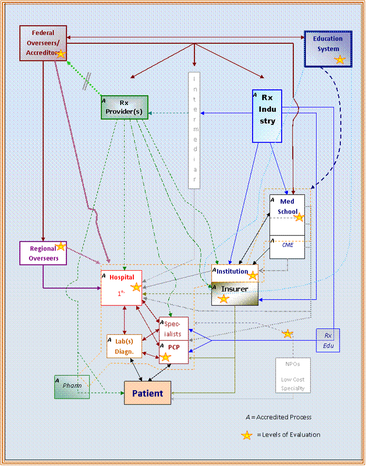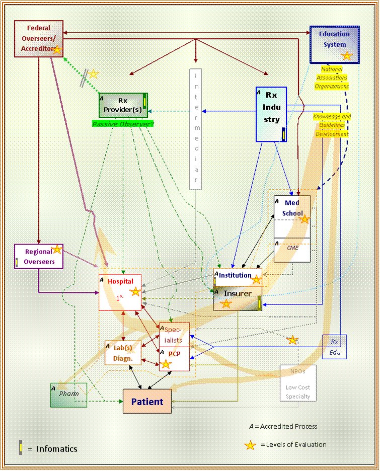 In the above flowchart, the one lone set of outsiders for this health care system consists of Rx Providers. This group consists of large scale industries that exist as groups or conglomerates of various businesses, each serving to provide its own one small part of the entire health care industry. The following depicts levels and agencies with measurements or QA activities in place: