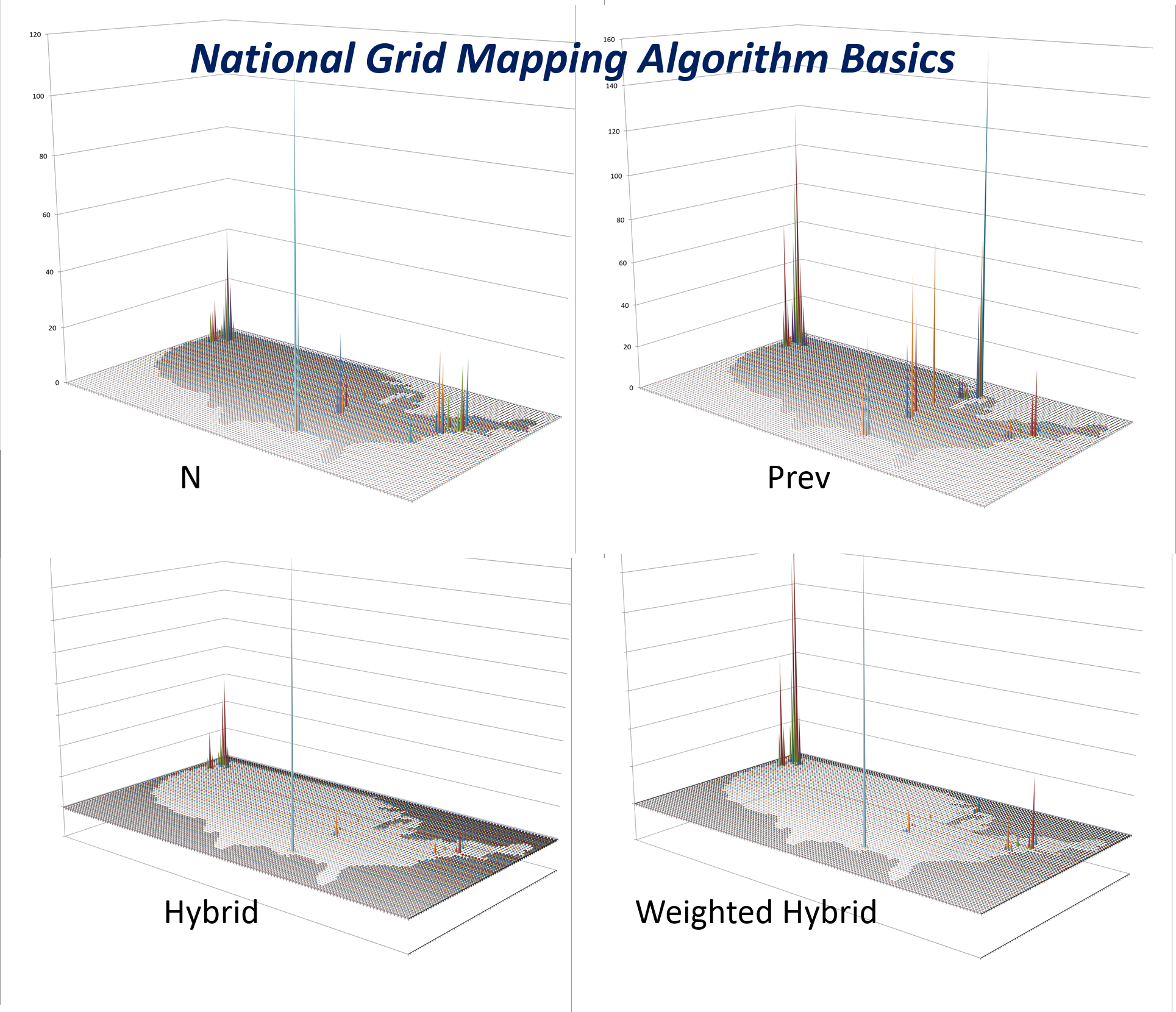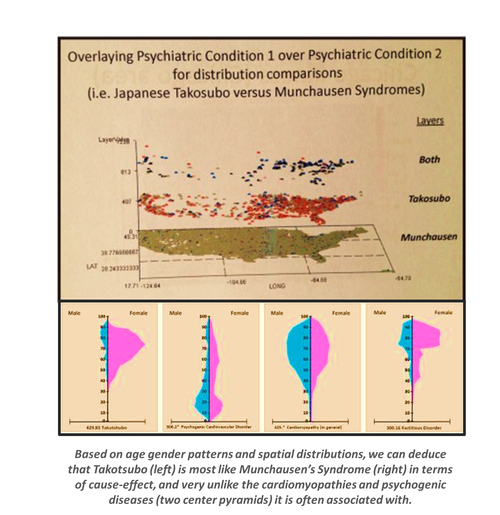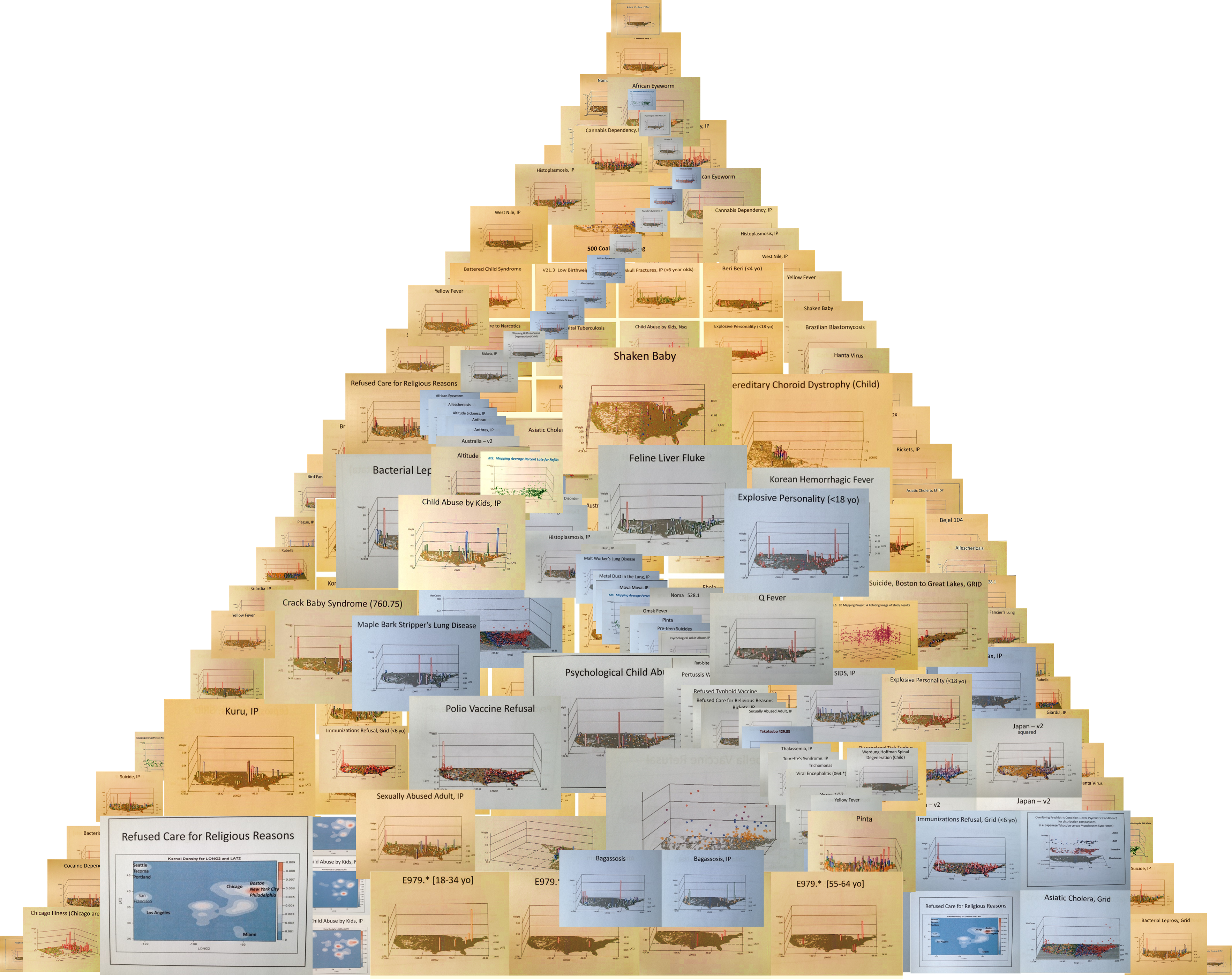 Four diagnoses evaluated for areal distributions. The most effective way to demonstrate spatial medical statistics and to use these to develop effective intervention programs utilizes 3D modeling (DX4). 3D images not only tell you the basic information learned by traditional maps (i.e. DX1,2,3), but also inform you of where to target your intervention activities and costs. The national population grid mapping technique uses small area analyses to identify foci for your starting points and helps to identify routes that are taken by these unhealthy behaviors or medical conditions (DX4).
