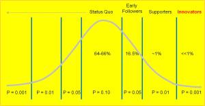 Great innovations occur when you discover something that you know the others in your field have not. It is an interesting experience being two or more standard deviations ahead of the norm. That is where the best discoveries are typically made. Such discoveries, once you have made them, are hard to express and prove to others who have not taken the time to keep up with you. This is due to the lack of interest many people have in making a discovery. Most people just want to behave according to the status quo. People want to follow the flock, not produce their own path.