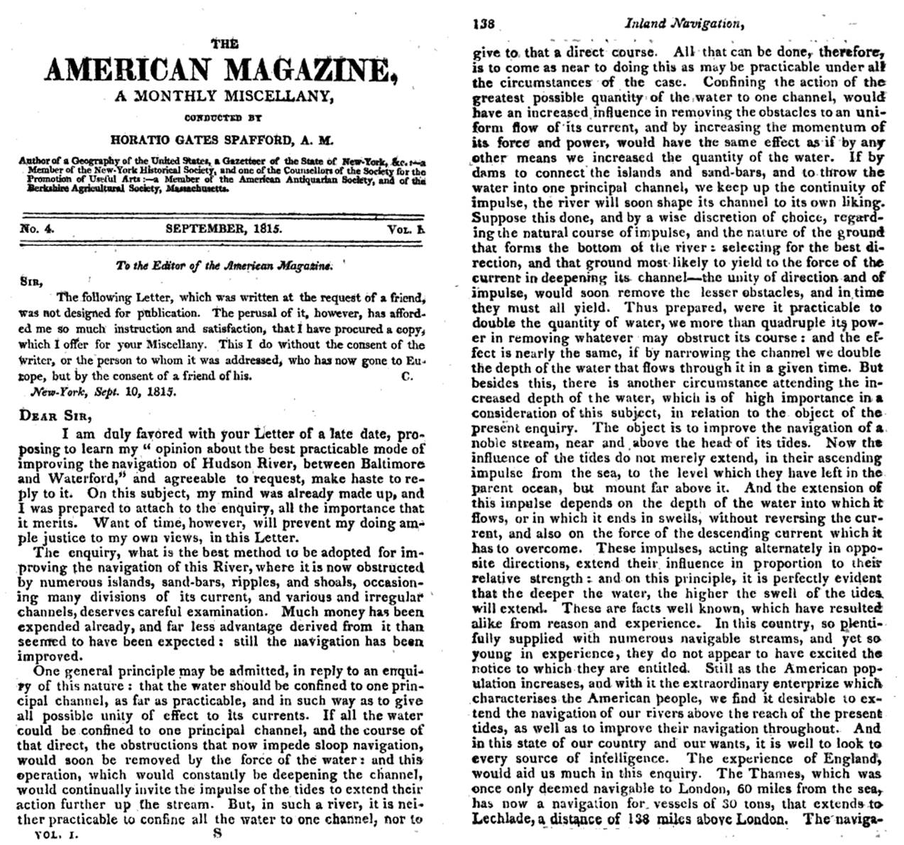 Meanwhile, throughout all of this politicking, there were the plans to increase the size of this country severalfold. The migration westward had begun due to the ability of Chancellor Livingston to secure for the United States the rights to much of the land west of the known post-colonial territorial claims. It was up to the local newspapers and magzines to keep the public informed on this important part of an early American version of the “Manifest Destiny” made popular sometime between 1840 and 1845 (this term was invented as a synonym to the phrase “divine destiny” coined by journalist John O’Sullivan’s to define the goals of the Democratic party for the time; see http://en.wikipedia.org/wiki/Manifest_Destiny). This early ideology attached to this national goal is what led to the Louisiana Purchase and the Lewis and Clark’s Exploration; such practices later became solidified and more routine around 1820, resulting in several Far West excursions by explorers, trappers and mountain men (Alexander Mackenzie, David Thompson, Jedediah Strong Smith, Joseph Rutherford, Joseph Walker, Peter Skene, Peter Ogden, Ewing Young to name a few). Many of these trips and journeys took place just a few years before and after The American Magazine was first published.