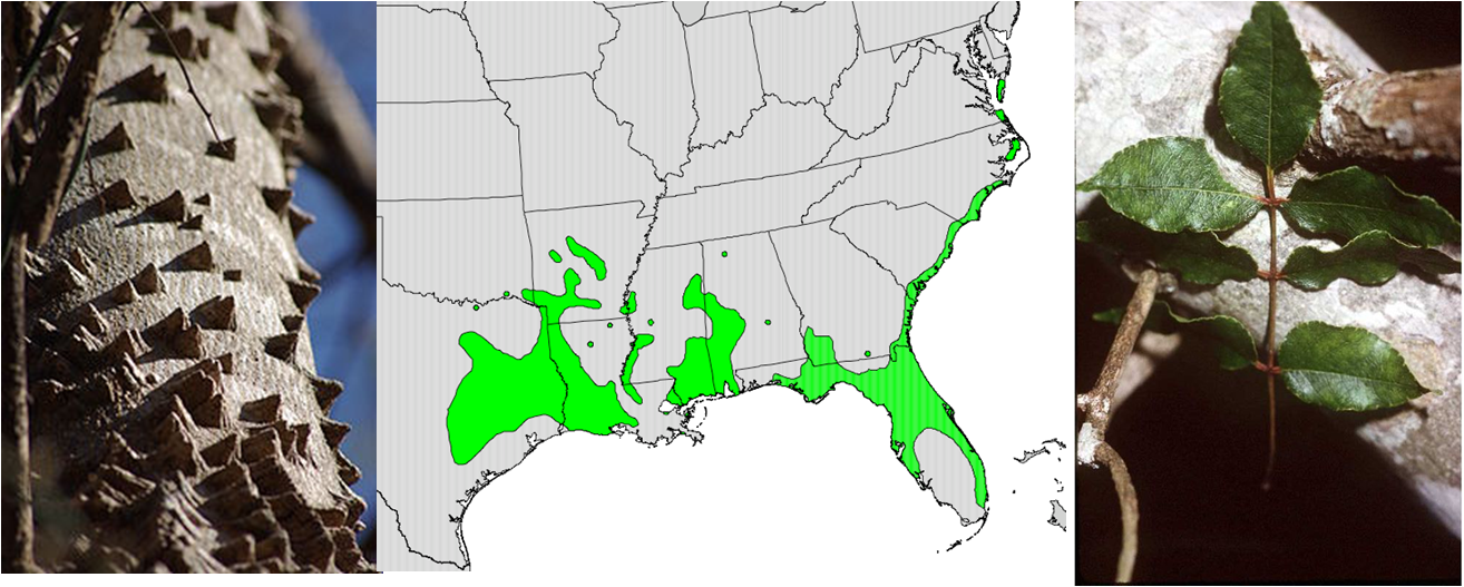 X. clava-herculis: The bark of this tree was used by the inhabitants of the White River area, in Arkansas, Feb. 1819, as a Toothache Remedy. [DOS: thorns/prickles?] With this use, we see a doctrine of signatures (thorns = teeth), and the wood is fairly white. The use of Xanthoxylum is from colonial times, ca. 1737-43 (see the page on Cadwallader Colden’s work). Colden is the individual who made this a most popular herbal medicine by the 1800s, although his was the Xanthoxylum americana species of New York.