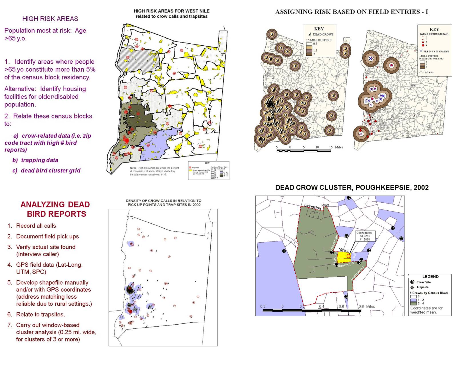 High Risk site analysis was performed based on crow vector analysis. Crow behavior was show to be primarily determined by human population density. Crows have a well defined series of migration routes they tended to follow into and through urban (topgraphy and ecology were indeterminable for these routes), with point-defined breeding/mating, food foraging, and social gathering sites. Most positive testing species are found in these human ecological sites, with positive testing directly related to these sites due to the association of potential west nile vectors with human ecological features, not natural ecological features. Following Voronov’s method for modeling enzootic and epizootic disease patterns published during the late 1960s to early 1980s (with initial input from Pavlovsky), Voronov’s method for disease ecological modeling was proven to be effective: i.e. west nile vectors require combined animal and human interactions for human based diseases to develop and for risk areas to be defined. The more natural an ecological siting is, the less likely it is for west nile to become a part of the local ecology. The more human based an ecological setting is, the more likely a region is to capable of harboring and maintaining a stable disease ecological state, capable of renewing this ecology the following year due to effective overwintering of infected female vectors. Spatial Analyst buffer analysis was performed for the upper right image; kriging tool and moving window extensions were used for the lower two examples in the above analyses.