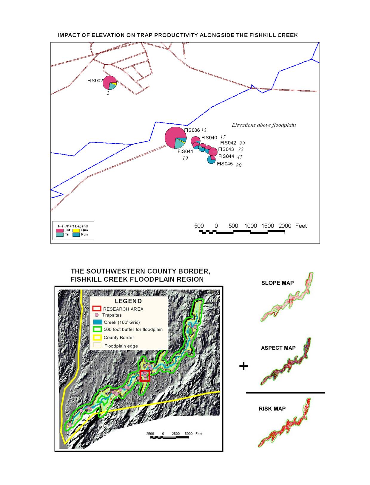 Several attempts were taken to perform linear transect studies of a given ecological-topographic setting. This kind of study focused on two major types of expected topographic effect on species distribution–effects of distance from water edge on species capture (x-y axis studies), and effects of elevation above local water level on species capture (x-y-z-axis studies). A study of the Fishkill Flood Plain revealed a definite impact on both species counts and densities relative to distance from water edge across a fairly flat floodplain (measuring 1+ mile long for each shore of the creek, with one side fairly well defined by a roadway already established). Other reviews of the creek edge along sections located closer to the Hudson River did not reveal any accessible, broad flood plain areas for duplicating this study. The Wappingers Creek also lacked any comparable ecological setting of this size to study.