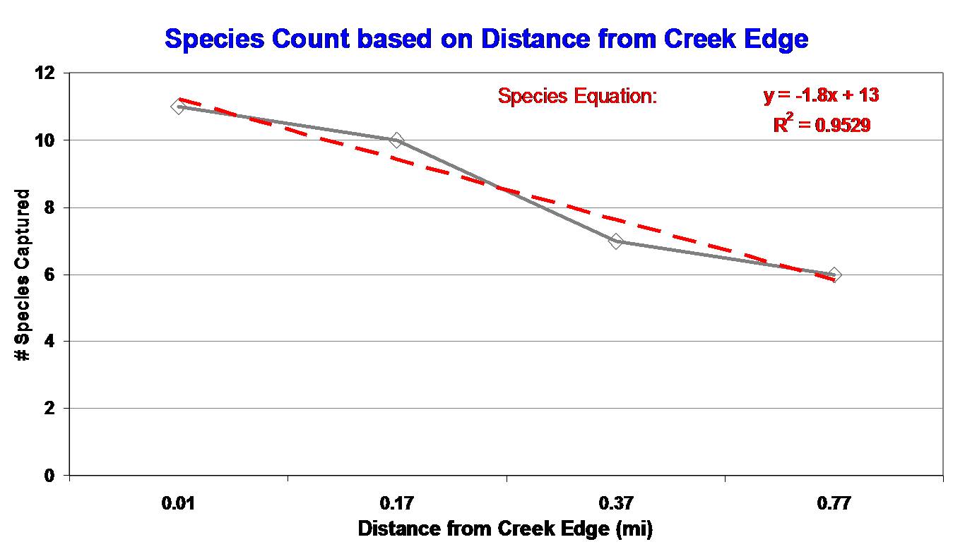 Mosquito Species Counts relative to Distance from Creek Edge