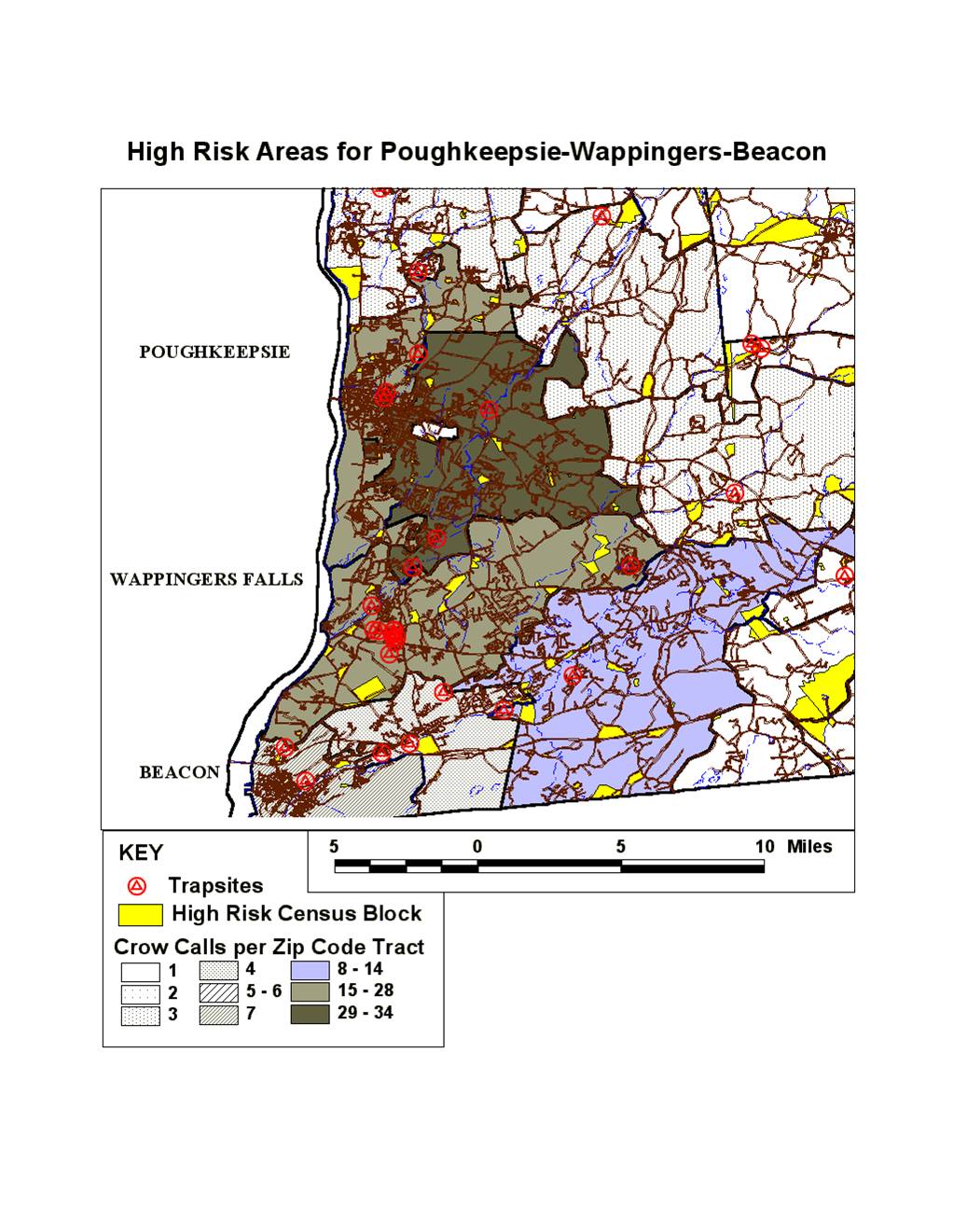 Crow Call density by Zip Code Tracts in the most populated section of the County