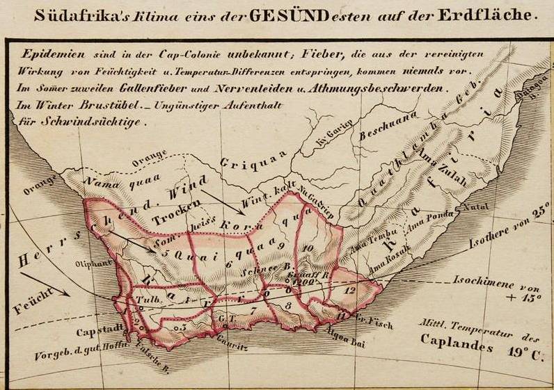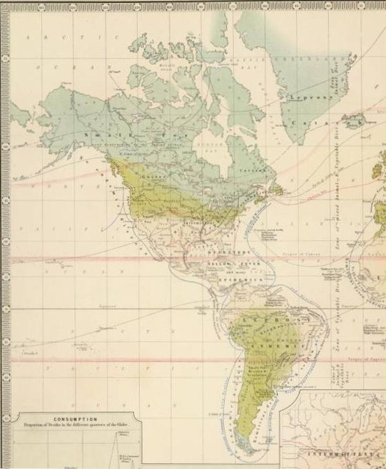 A section of Berghaus’s 1852 map of disease (Planiglob zur geographischen uebersicht der Verbreitung der vornehmsten Krankheiten, denen der Mensch auf der ganzen Erde ausgesetzt ist.Inset maps: Character-Krankheiten in N. Amerika, Antillen – Marschroute der Cholera, der verheerendsten Krankheit des 19ten Jahrhunderts – Südafrika’s Klima eins der Gesündesten auf der Erdfläche. From: Physical Atlas… (1852) by Dr. Heinrich Berghaus. To be covered on another page)