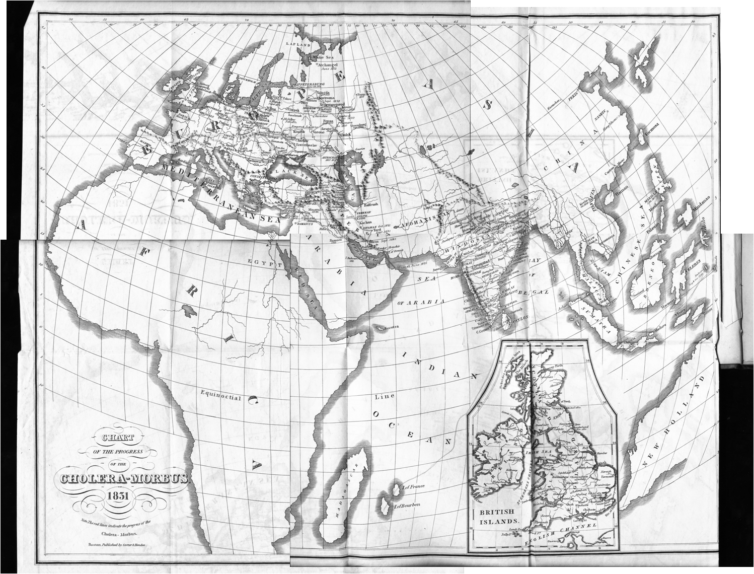 Scouttetten’s map is important because it represents these medical geography concepts when animalcules were still a part of nature, not the internal human being, and disease was primarily an end product of nature. The originator of the active, water-borne vibrio animalcule theory for cholera is attributed to Italian scientist Filippo Pacini in 1854. Throughout the 1840s, such a speculation was not yet made, and so the theories for how to prevent and treat this disease were based on theories linking the disease to contagion and animalcules, miasma, toxins and vital energy, even volcanoes, meteor strikes, and other very terrene causes.