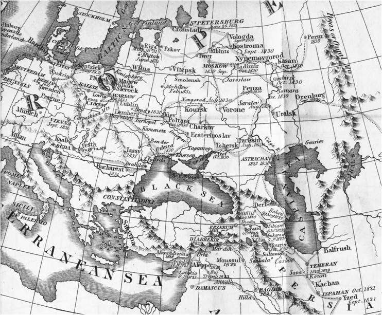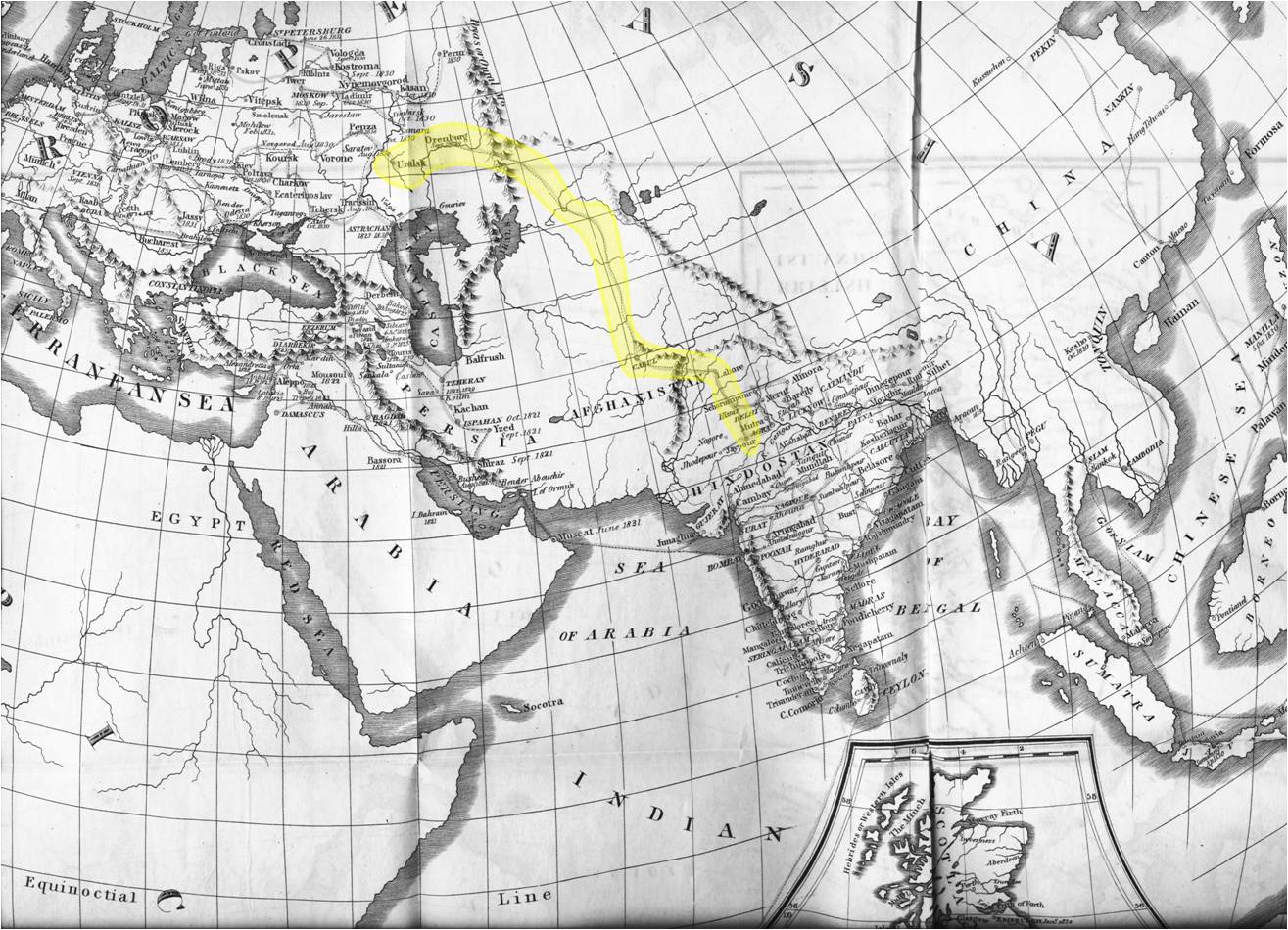 A close-up of the Military Route across the Ural Mountains, from Cabul, Afghanistan to Orenburg, Russia, and from there throughout Eastern Europe