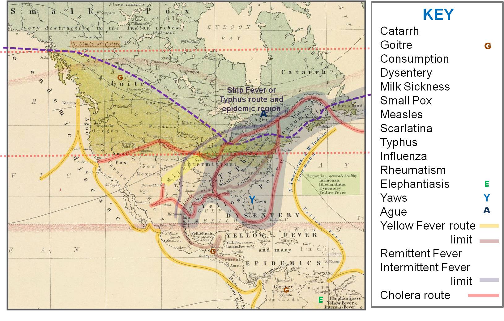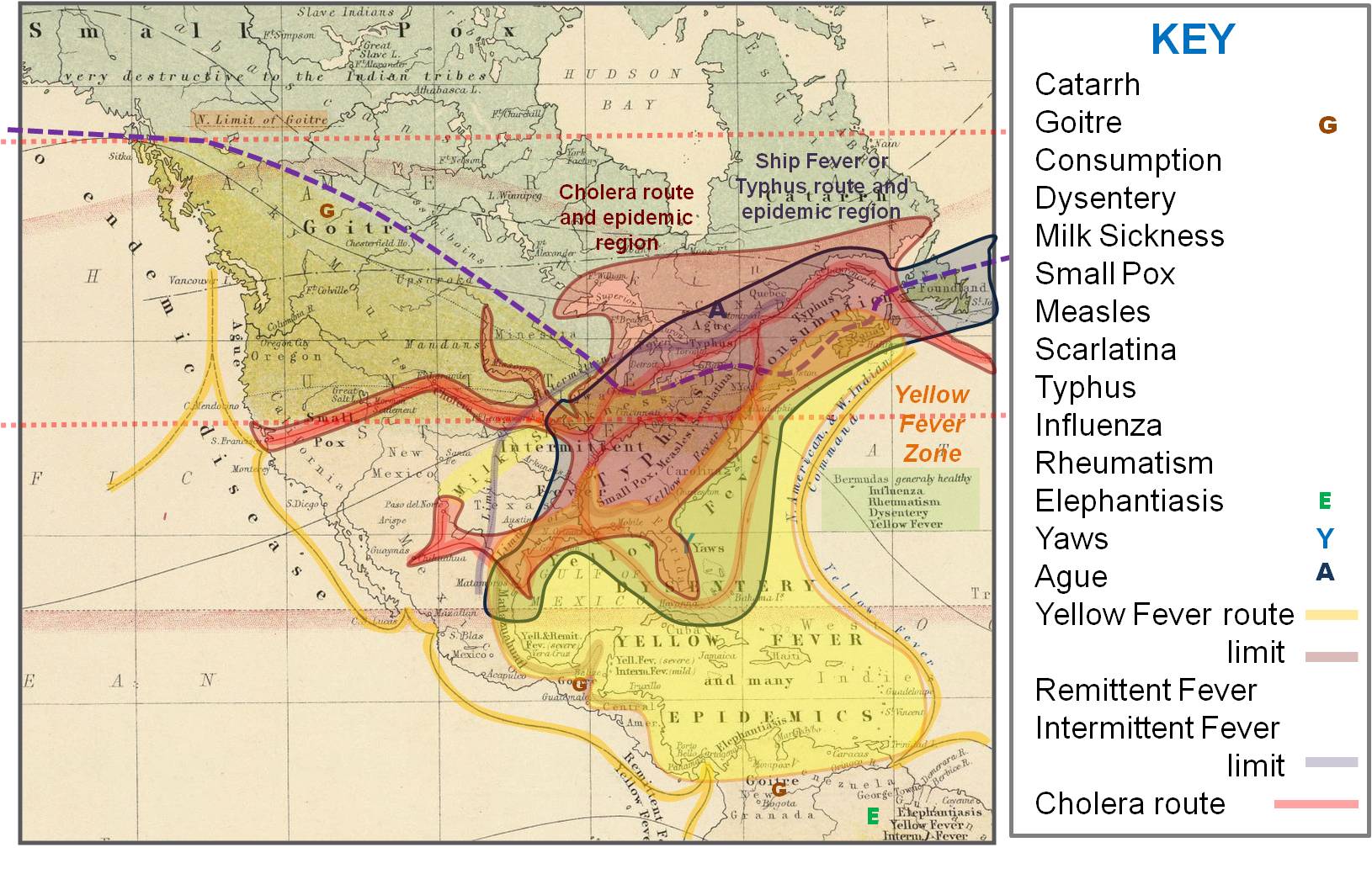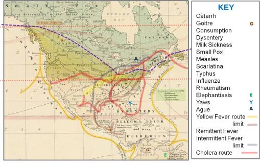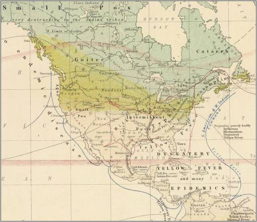 The goal of Johnston’s thematic map was to define the distribution of health and disease based on latitude-longitude, temperature, climatic, temporal, and topographic features. Many of the diseases on Johnston’s map appear on maps published elsewhere in the journal. Still other diseases were previously unmapped and placed on a map for the first time by Johnston. These diseases have an interesting history, like the Aztec disease matlazahuatl and the consumption mapped by Henry Bowditch reviewed in detail elsewhere on this site.