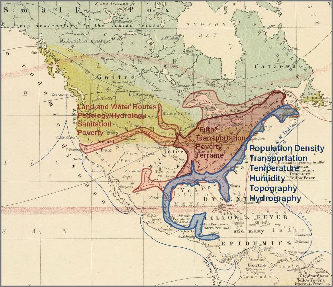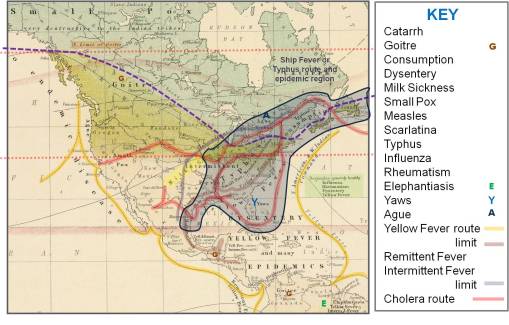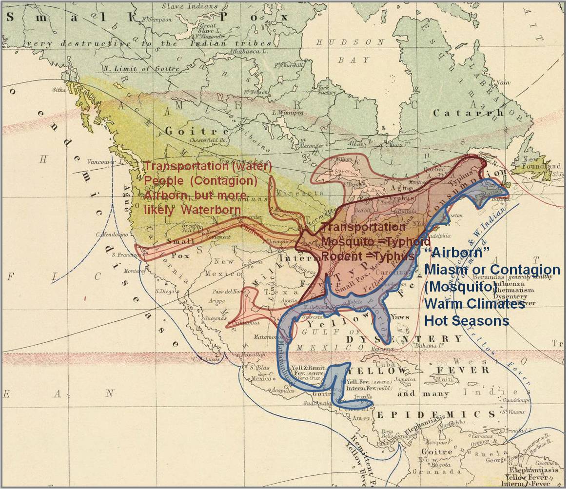 - Three disease zones or regions are defined based on the migration routes. Typhus and typhoid fever have not yet been fully differentiated. Both came in by ships (thus the name ‘ship fever’ in the mortality lists), but in the winter, this true typhus transmitted by rats was the form that prevailed. In a study of Illinois medicine it was noted in the published 1850 mortality lists and the history of Adams and Warren County areas (my biographical work on John Kennedy Bristow) that an epidemic occurred during the cold months; it was distributed in relation to ships docking along the Mississippi River and its Illinois tributaries heading into Peoria. This was more than likely due to typhus, generated by rats on board the ships, versus typhoid fever, a result of Salmonella typhi and allies introduced into and residing in contaminated waters. An additional complication to this study is the tendency for mosquito-bred or mosquito-season febrile diseases to be referred to as typhus or typhoid as well. These two weren’t fully differentiated until much later in the 19th century. See more on this on the page reviewing the Central Mexico disease geography map.