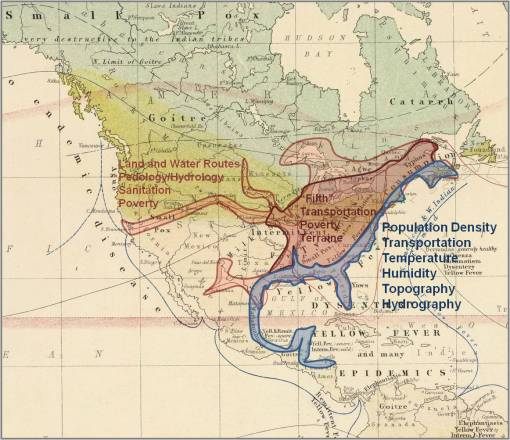 - Small Pox. Notice that the Small Pox regions are typically distributed in fairly rural if not wilderness regions. This feature of small pox is noted in the Pacific Northwest region just north of the Canadian border, and in the appalachian region (in smaller text, next to “Typhus”). This same high elevation, wilderness pattern for small pox is noted in the late 19th century Mexico disease map covered elsewhere on this site. By the time Johnston produced this map, the cause for small pox was very well known and its relationship to indigenous people almost completely understood. Therefore, it is safe to assume that Johnston’s decision for labeling these two regions as small pox prone was somewhat subjective, based on his knowledge drawn from other sources about indigenous people and territories.