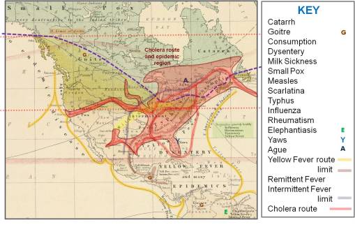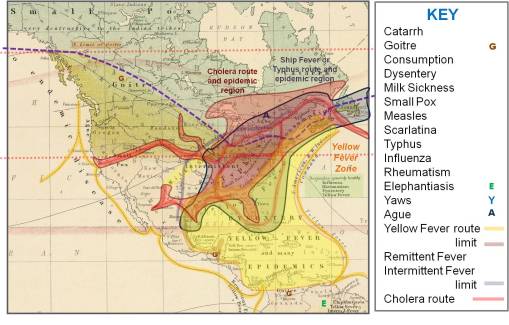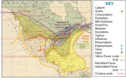 - We now see three zones in relation to the torrid, temperate and frigid zones. Notice the disease most limited in terms of temperatures is yellow fever. Typhus and Cholera have similar behaviors, with cholera making its way overland, versus the shipping routes favored by yellow fever, and probably inland shipping routes favored by typhus. Cholera is the only disease to effectively make its way into the frigid zone, suggesting a much stronger correlation and link to people’s activities and behaviors. The climate can be quite different from its endemic regions in India and Pakistan, and yet still be capable of diffusing this disease inland due to human population behaviors. The host-vector relationship of cholera (vibrio bacterium-ispods-shellfish-mammals) differs from that of typhus (bacterium-rat-humans).
