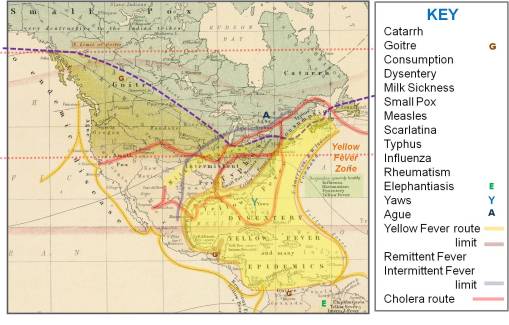 Compare the above with the next map by Johnston on Yellow Fever. Yellow Fever diffused primarily by oceanic travel routes and was limited by the need for proximity to shipping ports, ocean edges, and torrid and hot temperate zones. Its vector was a foreign mosquito brought in by ballast waters and barrels used to store water on board the ships.