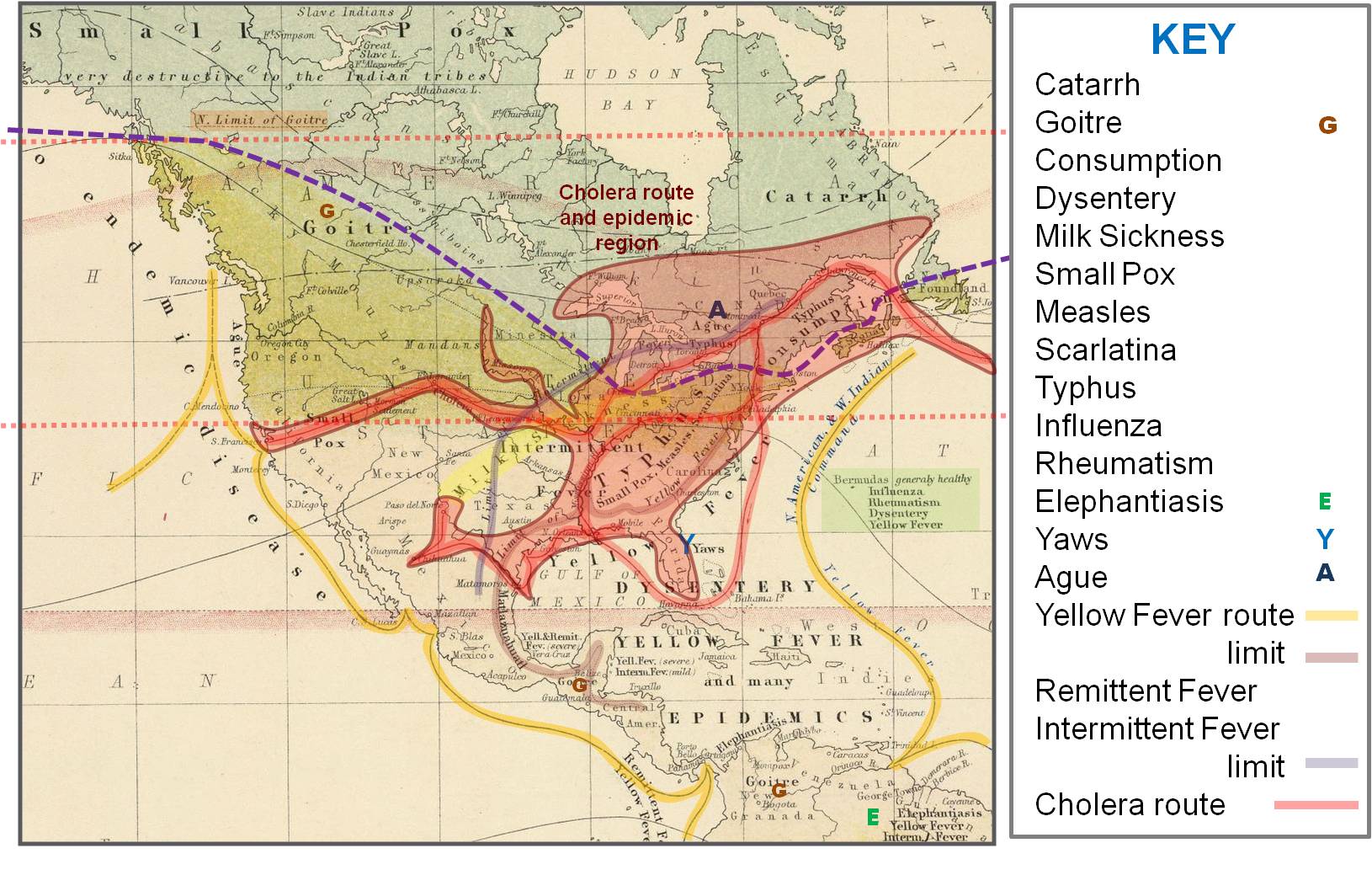 - The Key lists the diseases noted on this map; several of these have letters used to indicate their small ara locations.