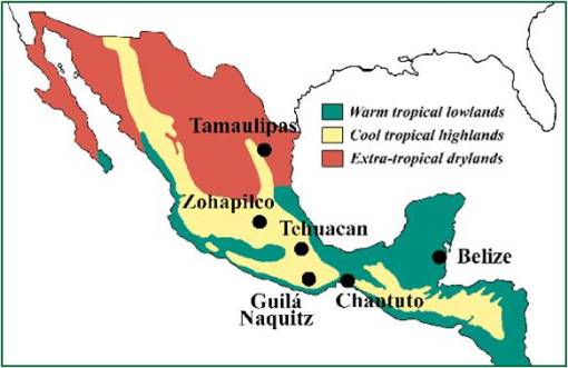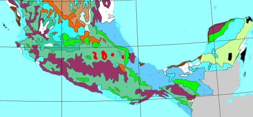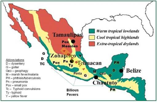 In the above version of the disease map overlain on the three climate regions defined for Mexico and Central America, there are some features that refer back to the late 16th century method (revived by Humboldt) of defining the three disease zones: torrid, temperate and frigid. The torrid zone approximates the extra-tropical dry lands, although low precipitation can be a significant difference in some of the hot-tropical forested regions versus the more arid extra-tropical regions. Warm tropical lowlands is the closest region on this map to those in temperate zones. With the exceptions of narrow bands found along the mountain faces at mid-elevation levels, temperature climates are going to be fairly uncommon when it comes to searching for the related disease types. The cool tropical highlands best approximate the temperature conditions of a temperate zone and perhaps the edge of the frigid zone, and the author’s definitions for diseases in this section point out the possibility that such a climate was often blamed for the ongoing epidemics classical to many of these indigenous cultural settings. The following region and zone related features are noted: