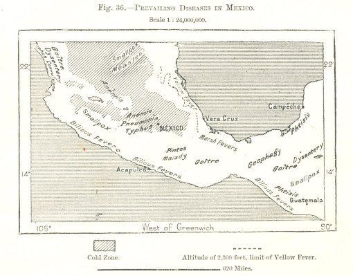 Phthisis, later known as tuberculosis and previously referred to as consumption, is very much a climate-elevation dependent illness. Although this is known at the time, this knowledge about phthisis was perhaps commonplace and expected to be borne by any reader of this map or article. The elevation requirements of Yellow fever are noted, but not those of Marsh Fevers. Based on location (Yucatan peninsula), perhaps one of the most important sustaining environmental features for Phthisis is humidity; later scientific studies of tuberculosis in fact support this suggestion about its distribution based on the disease map.