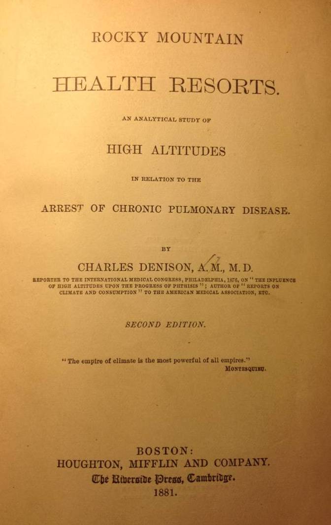Charles Denison played a very important role in the history of medical topography and disease due to his work as a physician focused on tuberculosis or consumption patients. During the 1870s, Denison removed to the Denver, Colorado area and opened up a treatment facility where he promoted the residency of this region for people afflicted with the deadlier forms of tuberculosis. About this same time, a Jewish group initiated a similar facility serving the same population of individual back east. The Jewish hospital remains active to this day in the Denver area and remains the primary facility for treating uncontrollable, resistant strains of tuberculosis. Denison’s facility was closed but most of the belongings turned over to it replacement.