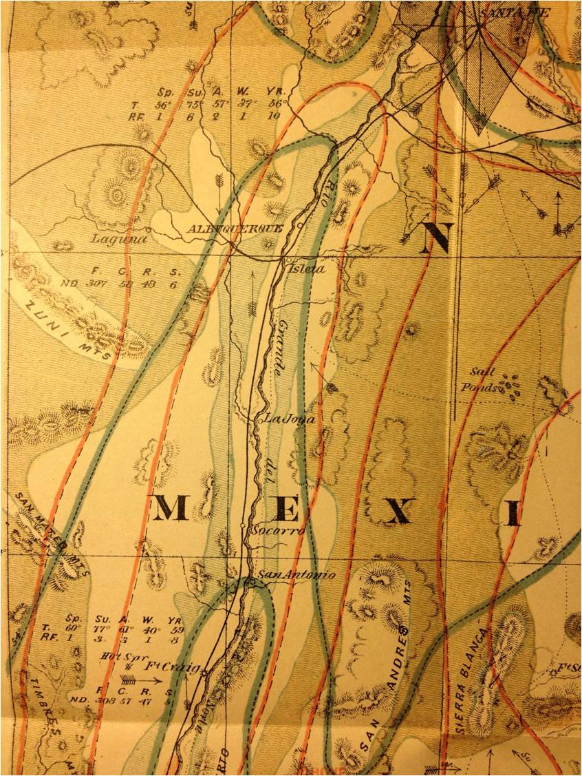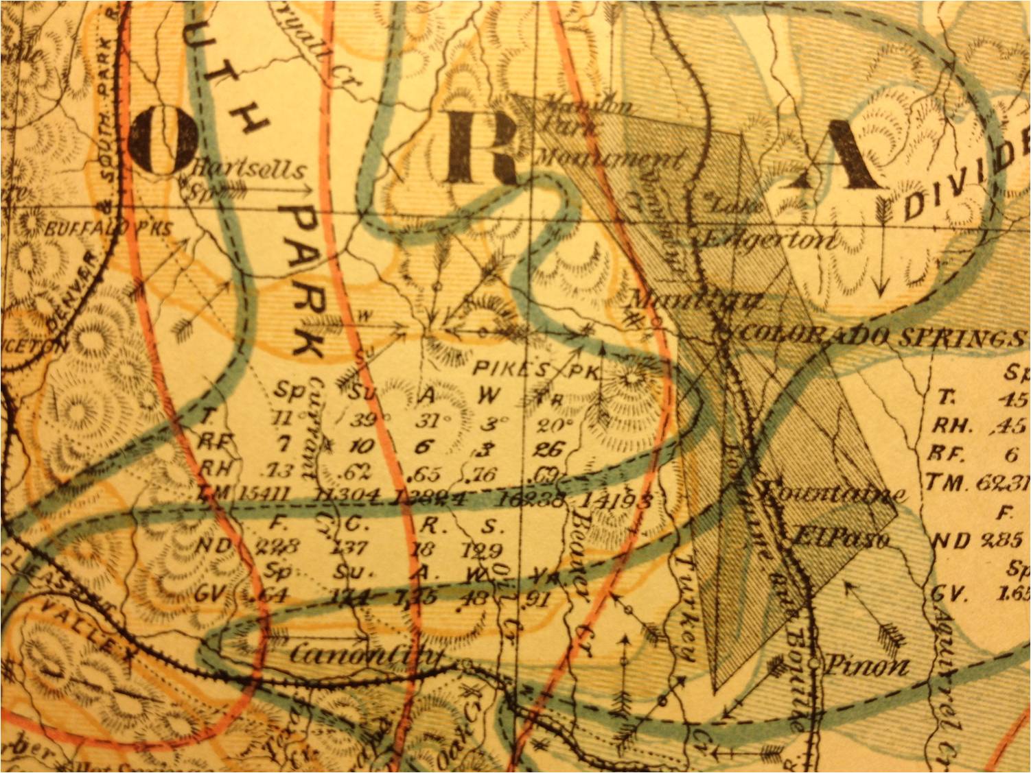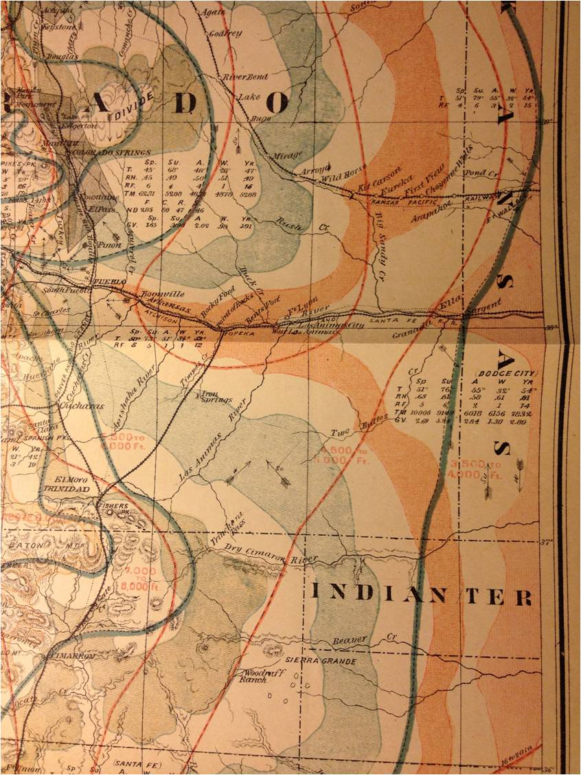 The above details are for the climate around Pike’s Peak, near Manitou Springs. This section of a map provides Temperature (ºF), Rain Fall (in.), Relative Humidity (%), Total Movement for wind flow (miles), each by Season (Sp,Su,A,W) and as year total (YR), along with ND=number of days for year’s weather, for Fair (F), Cloudy (C), Rainy (R), and Snowy (S) days, and GV = Grains of Vapor per cubic foot of air, corrected for elevation. Arrows depict wind direction; arrows with a line across their shaft indicate direction related to rainfalls, arrows with a circle on the shaft indicate winds unlikely to bring rain. Pound signs (#) indicate hot springs. The grey polygon is a research area (Denison called these “S.S. Stations”), used to study wind flow patterns for the area in 1875 (recorded thrice per day); the above long edges depict approximately 270 days of wind flow along the two longest axes drawn in this polygon over Colorado Springs (WNW-ESE, and NNNE-SSSW). Orange lines are isotherms, green lines are for annual rainfall.