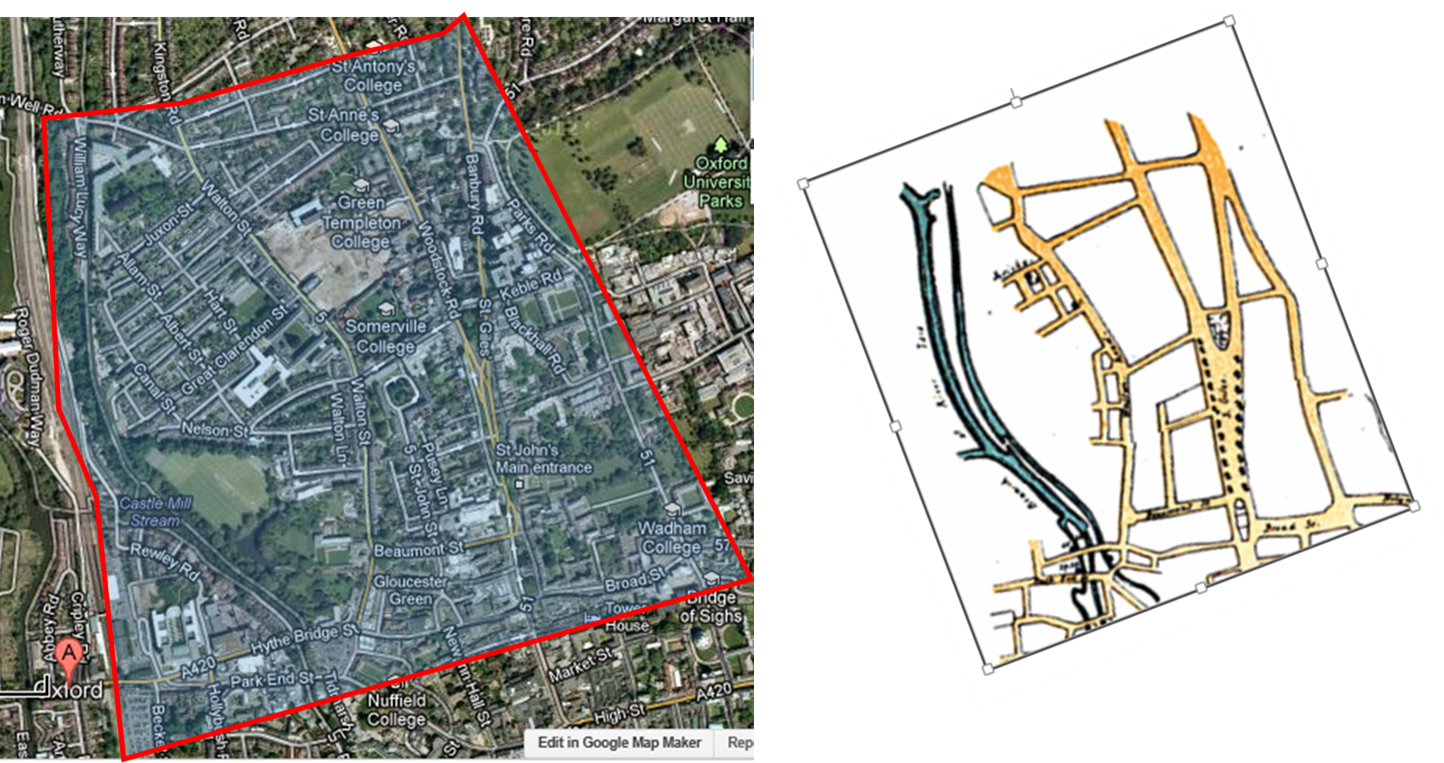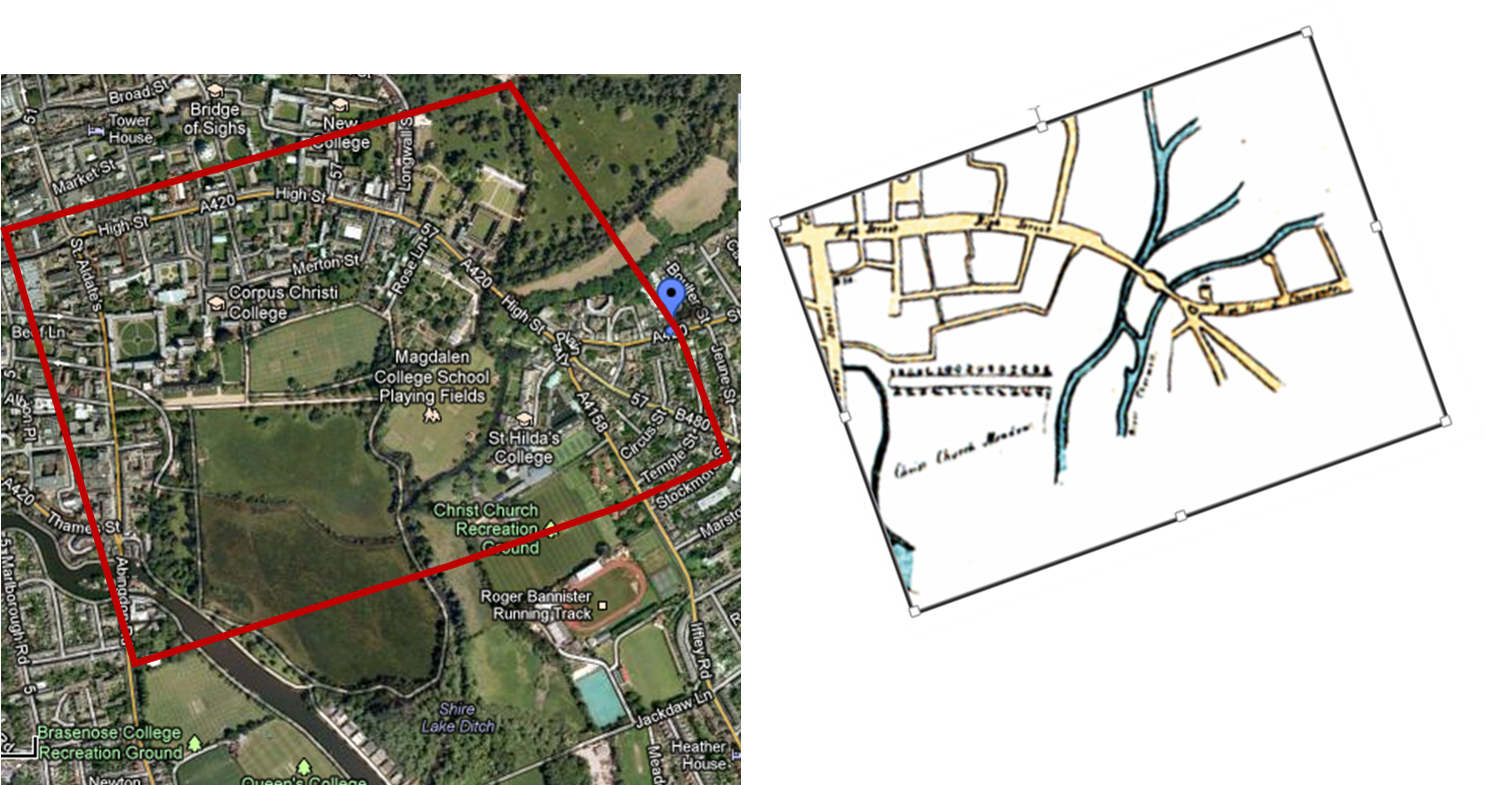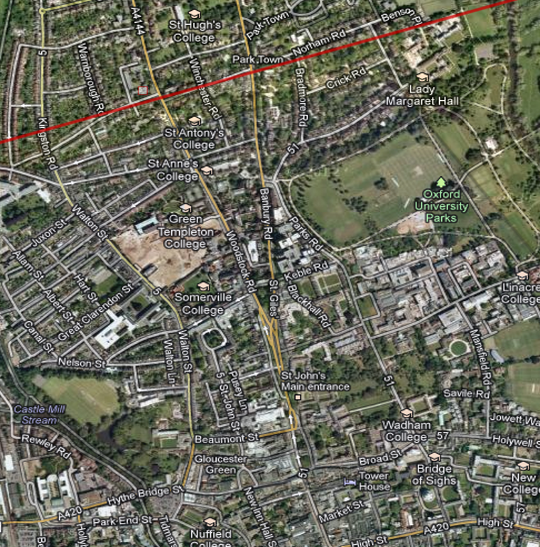 In the above map note the positions of High Street and Banbury Road delineated in red, and the smaller streets associated with these streets along the eastern edge of the Oxford campus area.