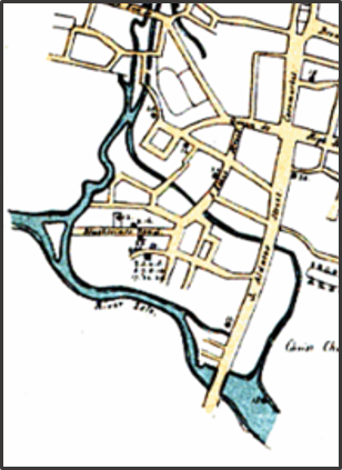 A few minor discrepancies are also noted in this comparison above. (The blue point indicator is a default of the Google Map–due to an osteopathy school advertisement). Also notice that most discrepancies in these maps pertain to river and creek patterns. The case cluster was an array of temporary residencies located just beneath the very light cross road through the green space.