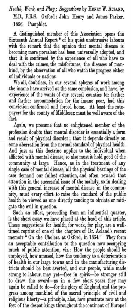 With physical disease manifestations, this is an easy promise to state and define to some precision. Such is not the case for mental health, which was the crux of Acland’s follow-up to his essay on Asiatic cholera, which makes the same claim about the need to adequately care for the poorer classes with regard to mental health.