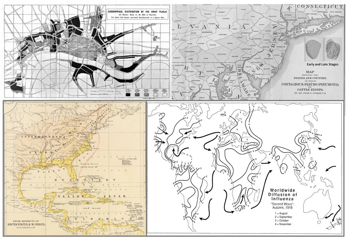 The following maps can be related to the above or Pyles models. They depict the Plague ca. 1600-1700 (upper left), the distribution of yellow fever by diffusion and transportation (lower left) 1800-1825, the animal born Bovine Tuberculosis or Consumption c1855-1883 (upper right), and the global diffusion of the second wave of the 1918 influenza epidemic (lower right).
