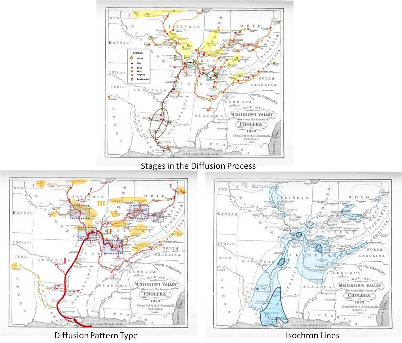 Peters took the opportunity of working for the government in documenting the 1877 events involving cholera, obtaining as many maps as he could from others in the field and then using these and the results form his own studies of cholera epidemics to produce global maps of this disease. From these maps and from other readings Gerald Pyle engaged in regarding cholera, Pyle was able to produce his own temporal, behavioral maps about cholera activity. The basis for Pyle’s maps were the numbers of theories that already existed out there about transportation and the economy. He reviewed disease diffusion like it was the diffusion of a new product or an idea, trying to determine the reasons socially and physically for the paths that were taken. He used this thinking to develop the three means in which a disease is spread, the descriptions of which are found much later on this page.