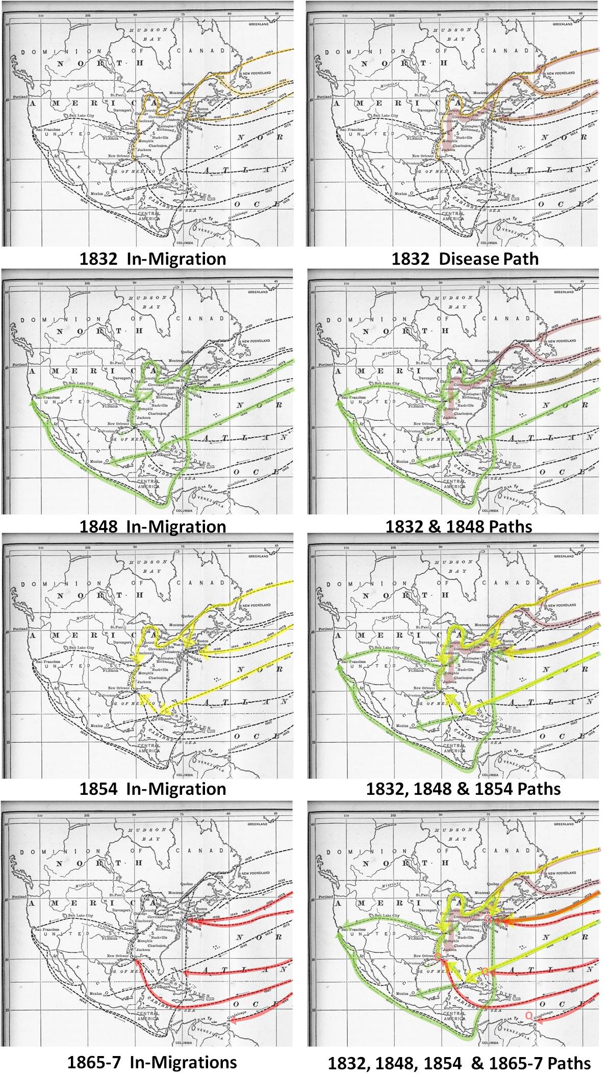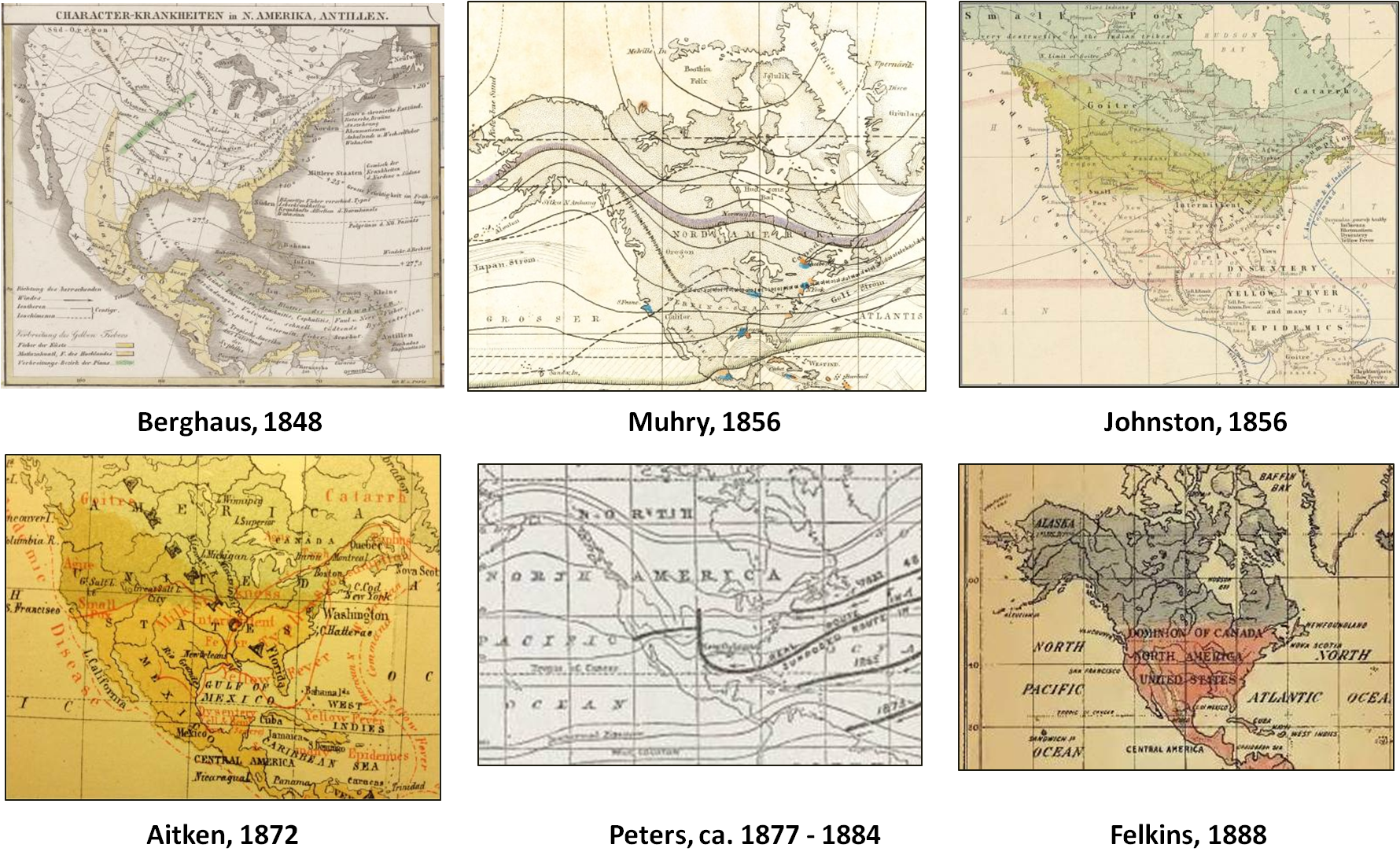 With the above disease diffusion mapping exercises, a number of different trains of thought were pulled together to see if ‘anything new pops up’, to put it lightly. Pyle’s review of disease migration takes into account the specialties known as human geography, population geography, environmental geography and and transportation geography. Relating Pyle’s work to past maps adds value to historical disease map research and analysis and provides us with insights into how to make new pattern recognition with the more recent and current mapping techniques and outputs. The past mapping provides us with examples of what happens in history as diseases migrate. This information enables us to be more accurate interpreters of our own maps placed before us on the computer screen. Most importantly, temporal and spatial behaviors tend to correlate, and we can see this again from historical mapping.