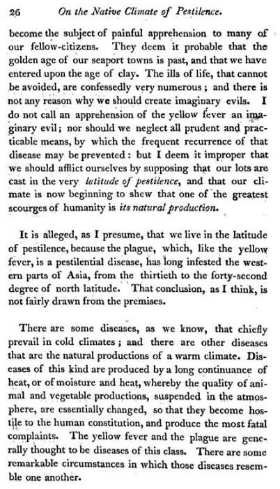 The philosophy that led up to this letter was derived from beliefs once abundant in the early 1800s, when Noah Webster published his treatise on the growing number of epidemics worldwide. Webster claimed these were due to the population growth and economic expansion this world was going through, resulting in changes in climate and the migration of epidemic/endemic disease patterns to new places, causing new diseases to develop as well due to changes in our manner of living. Throughout much of this time, there was this new philosophy held by some which stated that changes in “disease type” were taking place as a result of changes in land use and our cohabitation with each other and with nature. As the places we chose to live in were modified, so too were the diseases they developed, and since diseases and climate were typically linked closely to each other, the prospects for the future at times looked bleak, as if Malthus’s claims from 10 to 15 years earlier were about to come true.