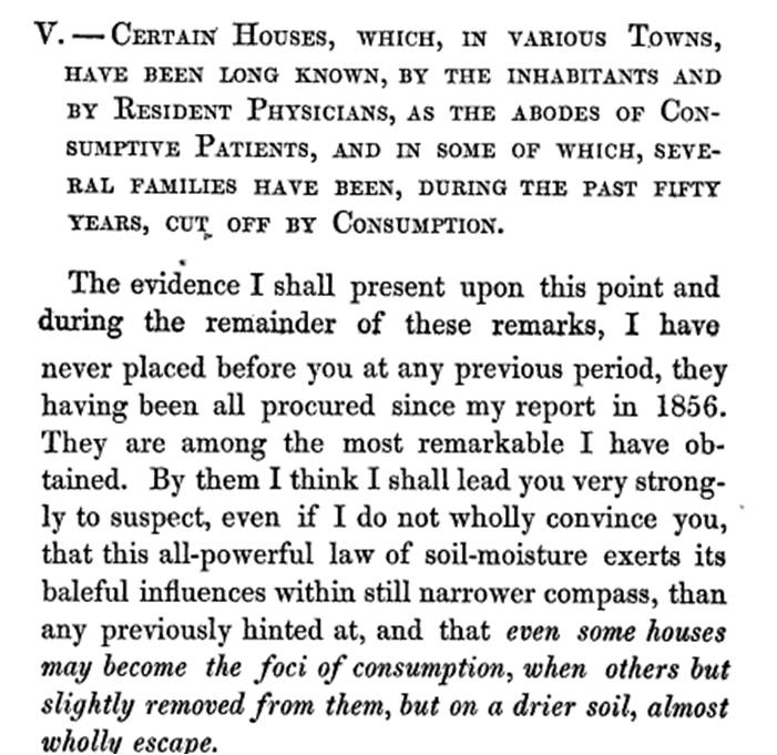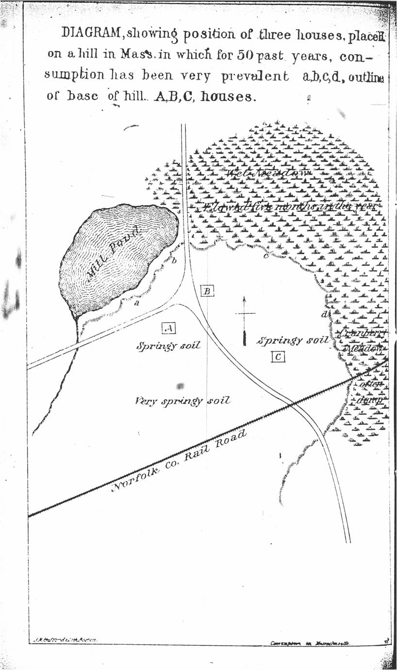 Many years ago, and before I had arrived at definite conclusions on this subject, I was visiting Franklin, Mass., on professional business, and I asked the physician whether “any portion of his town was peculiarly liable to consumption.” His prompt response was “Nay.” In a few moments, however, and in continuation of the subject suggested by the question, he said—” But I wish you would explain why three houses in this town have been famed for having had consumptive families in them.”