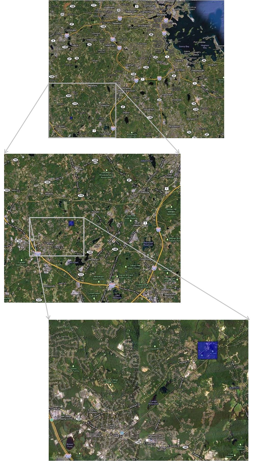 The area for which Bowditch drew up for his map was reviewed located using Google Map, and the places for all of Bowditch’s point data could be located. Some of the houses may have been built-up some, and some of the formerly undeveloped land was by now changed significantly due to obvious landfill procedures engaged in for the purposes of industrial use. But overall, this resulted in little modification of the immediately local hydrologic pattern. The downtown portion for this village location appears unchanged more than 150 years after Bowditch produced his map!