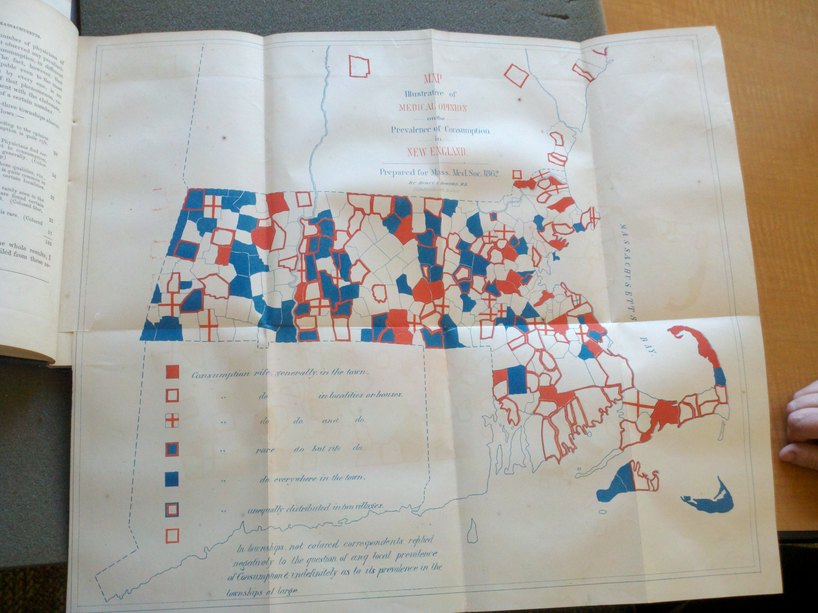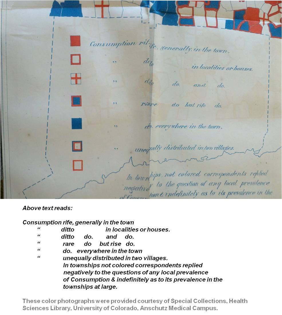 This merging of philosophies resulted in the famous consumption map for Massachusetts produced by Henry Ingersoll Bowditch. This map was displayed to the State in a presentation given at the 1862 annual meeting for the Massachusetts Medical Society entitled Consumption in New England: or, Locality one of its chief causes. An address delivered before the Massachusetts Medical Society (Ticknor & Fields, Boston, 1862). Bowditch dedicated this work to Dr. Edward Augustus Holyoke.